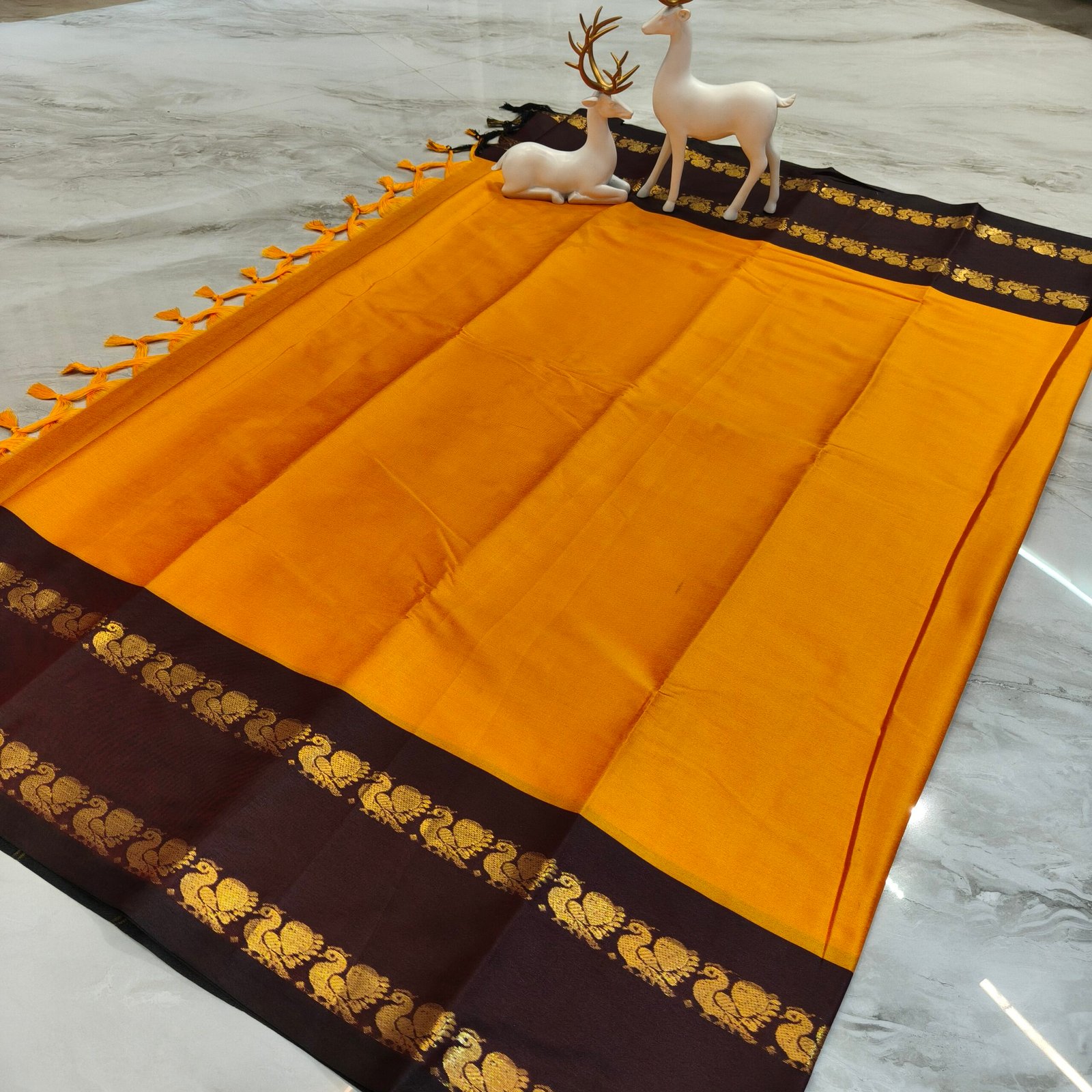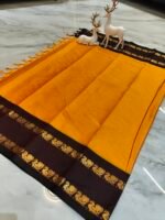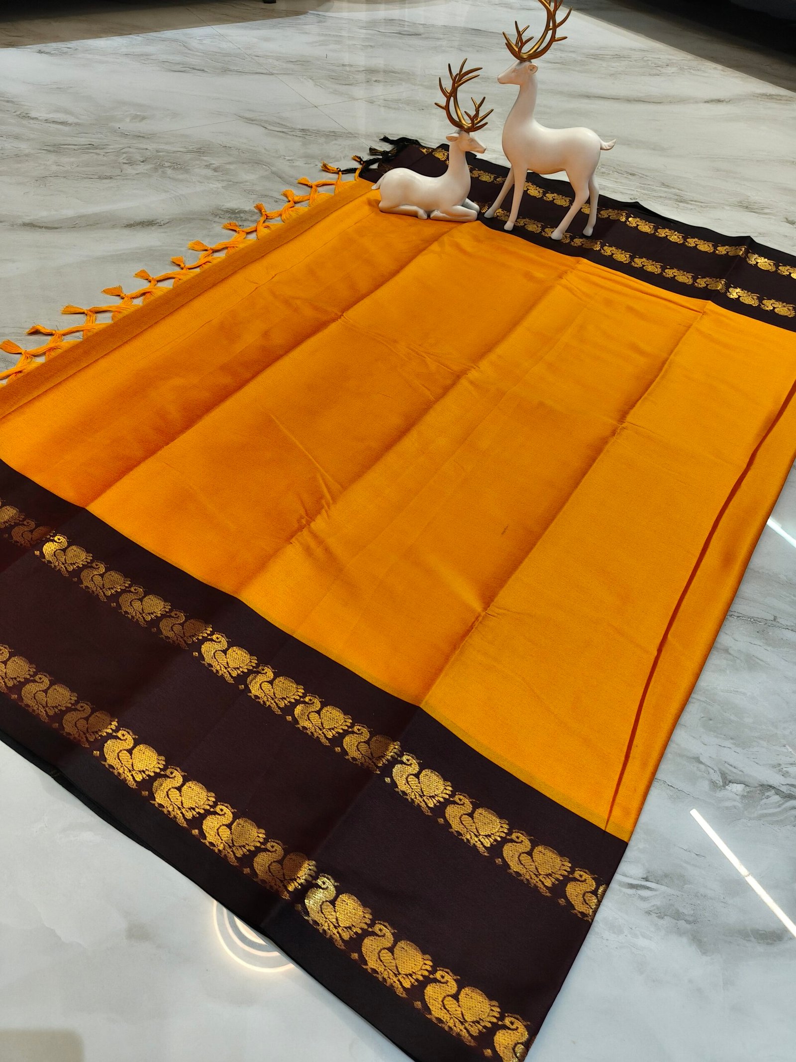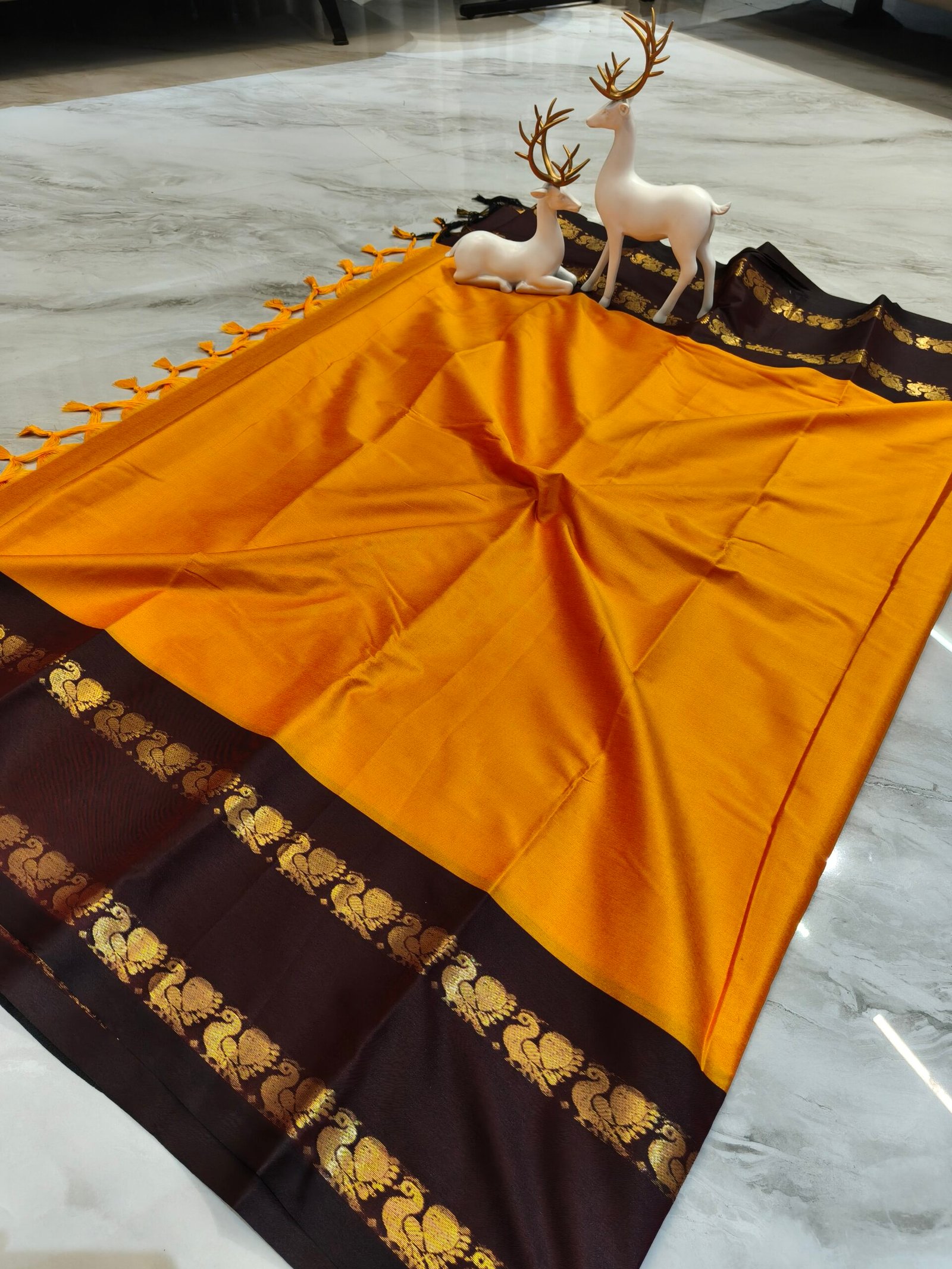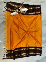 Add a touch of elegance to your wardrobe with this vibrant mustard yellow saree paired with a bold black zari border. The rich color combination gives a perfect balance of traditional charm and modern sophistication.