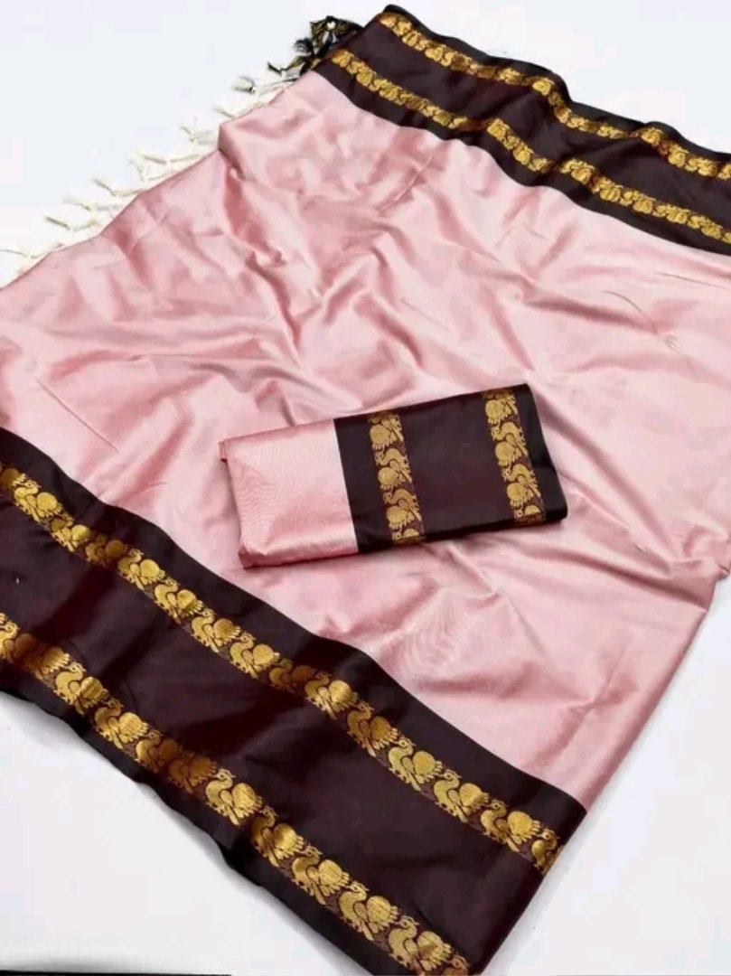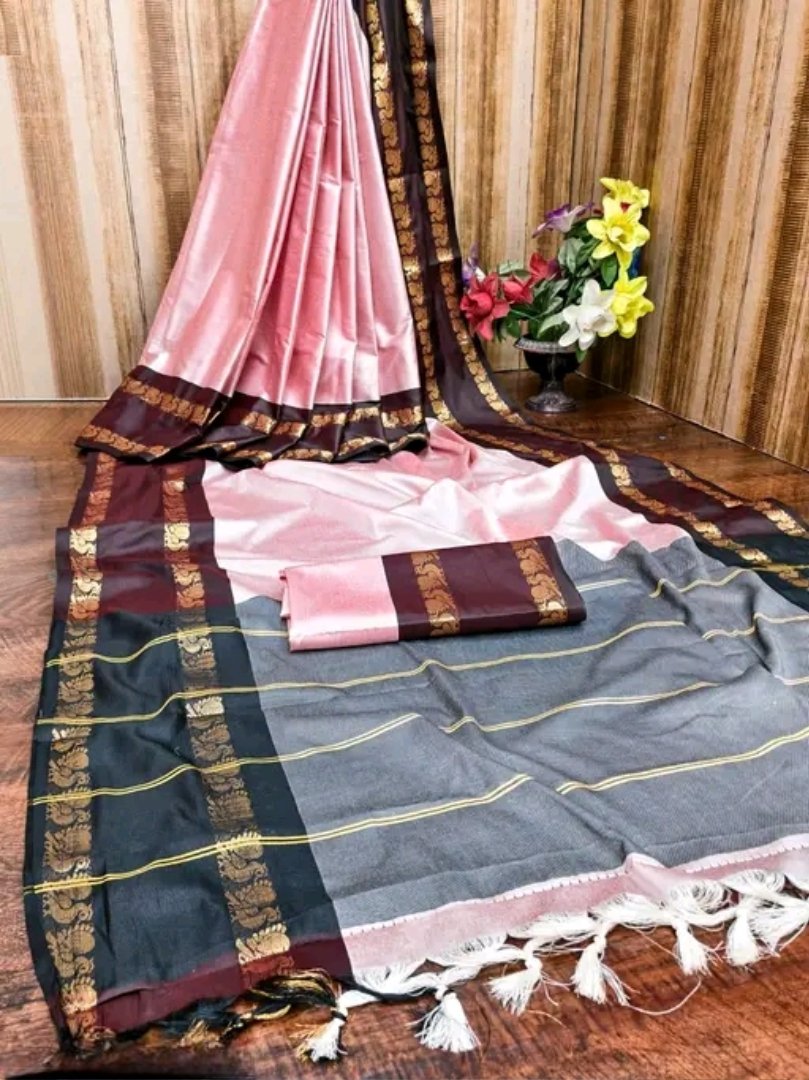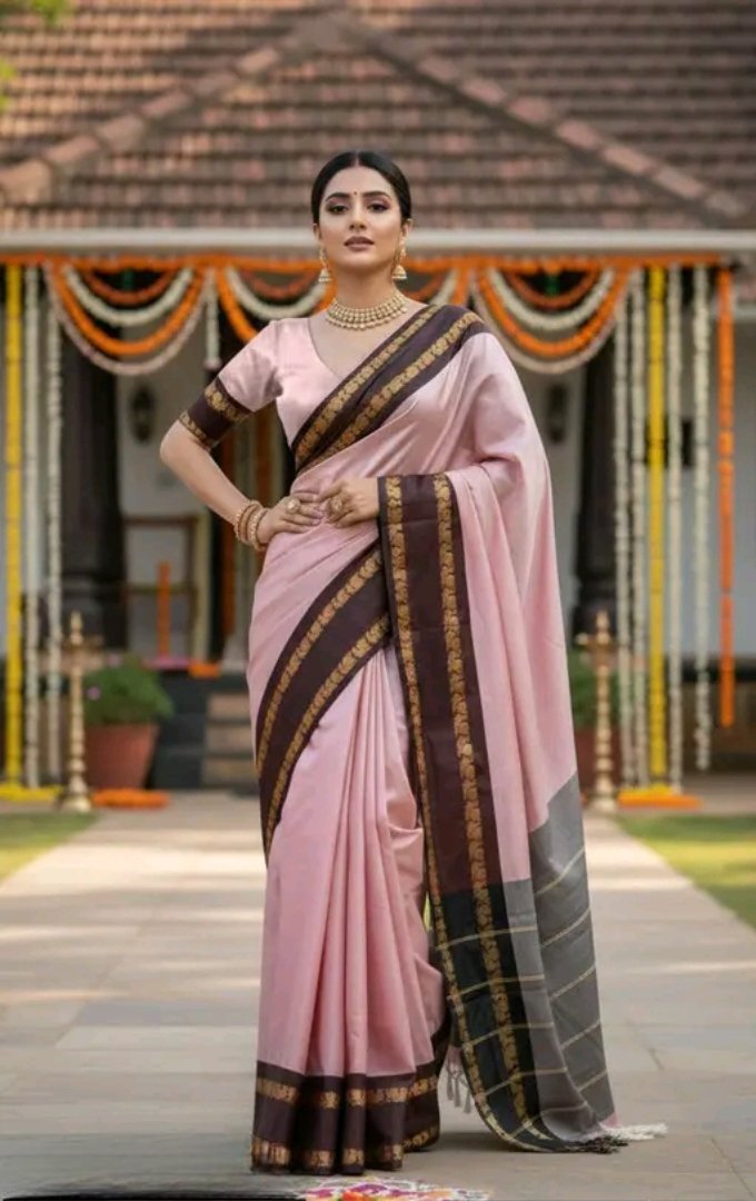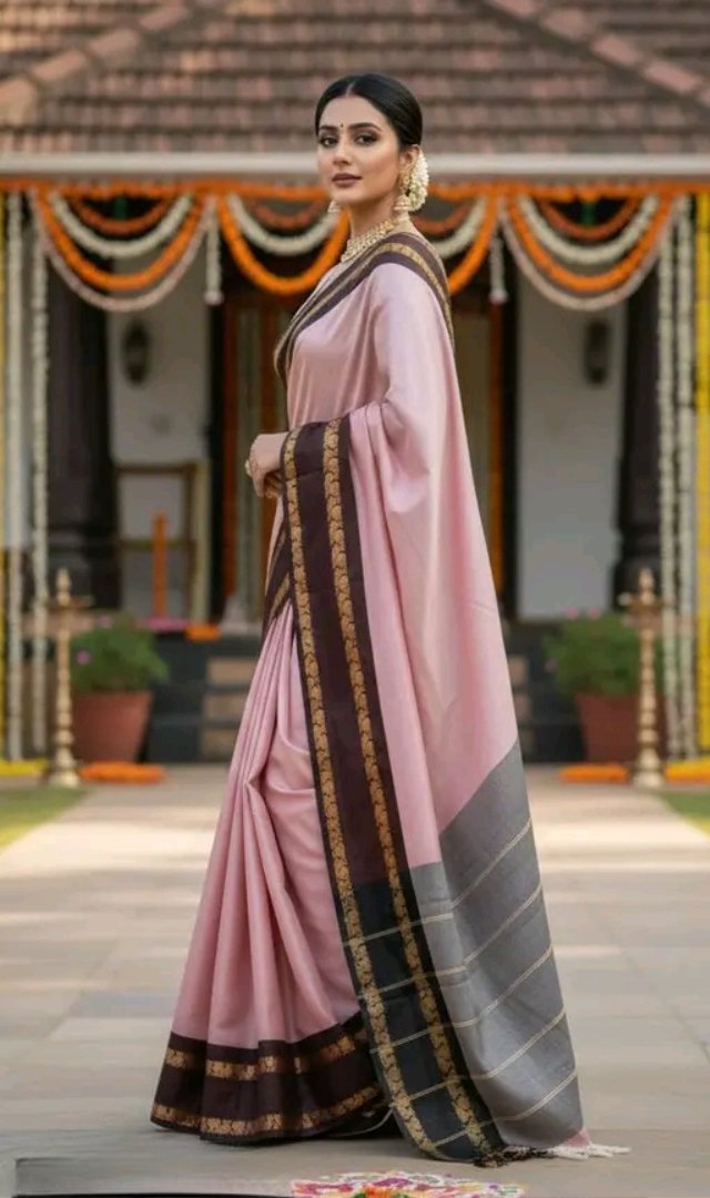 Enhance your ethnic style with this graceful baby pink saree paired with a rich maroon zari border. The soft pastel tone gives a delicate and elegant look, while the bold maroon border with traditional motifs adds a touch of royal charm.