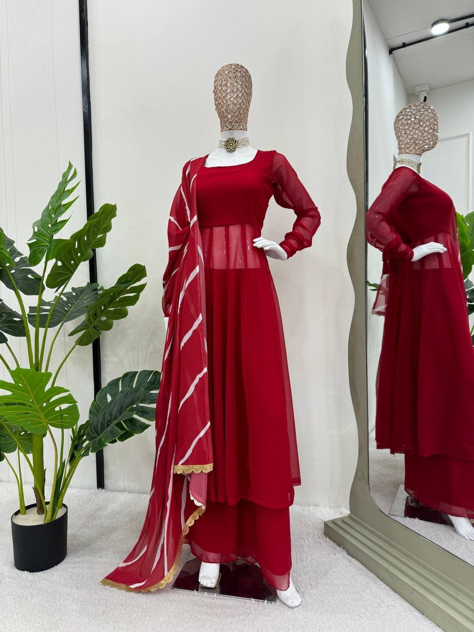 The soft micro inner ensures comfort, while the fully stitched plazo with elastic provides ease of wear. Lightweight and graceful, this outfit is perfect for festive occasions, parties, and celebrations.