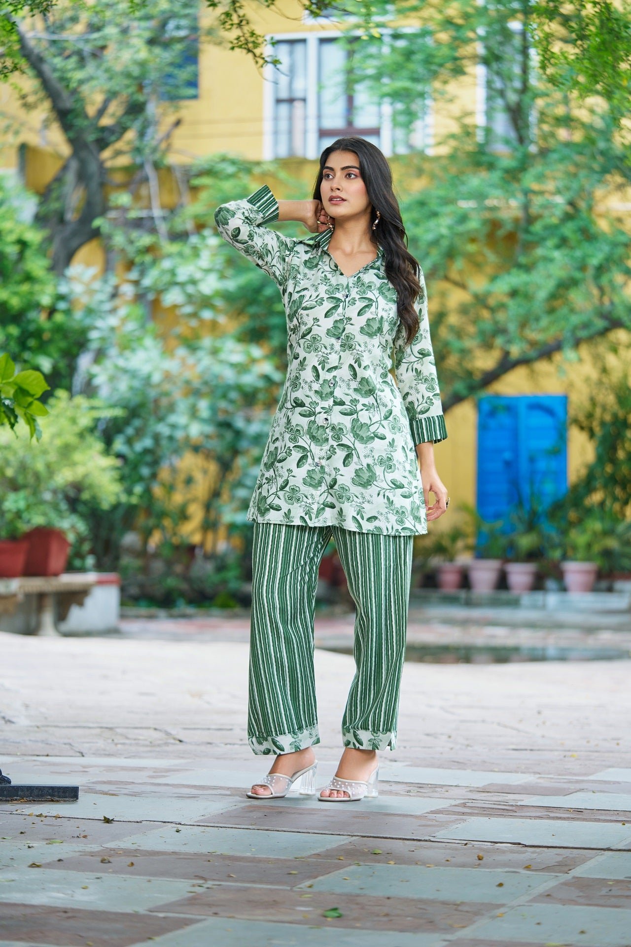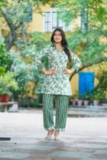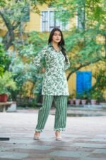 Add a refreshing touch to your wardrobe with this stylish green floral printed women’s co-ord set. The outfit features a beautifully designed floral printed tunic-style top paired with matching striped straight-fit pants for a trendy and coordinated look. Made from soft and breathable cotton fabric, this set offers all-day comfort while keeping your style effortlessly elegant. Perfect for casual outings, daily wear, vacations, and relaxed gatherings.