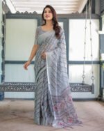 Be the first to review “Grey Pastel Geometric & Floral Print Pure Cotton Linen Saree with Blouse and Tassels | Crown Fashion”
