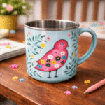 Hand-painted stainless steel mug with vibrant artwork, durable finish, and perfect for everyday tea or coffee at home and office.