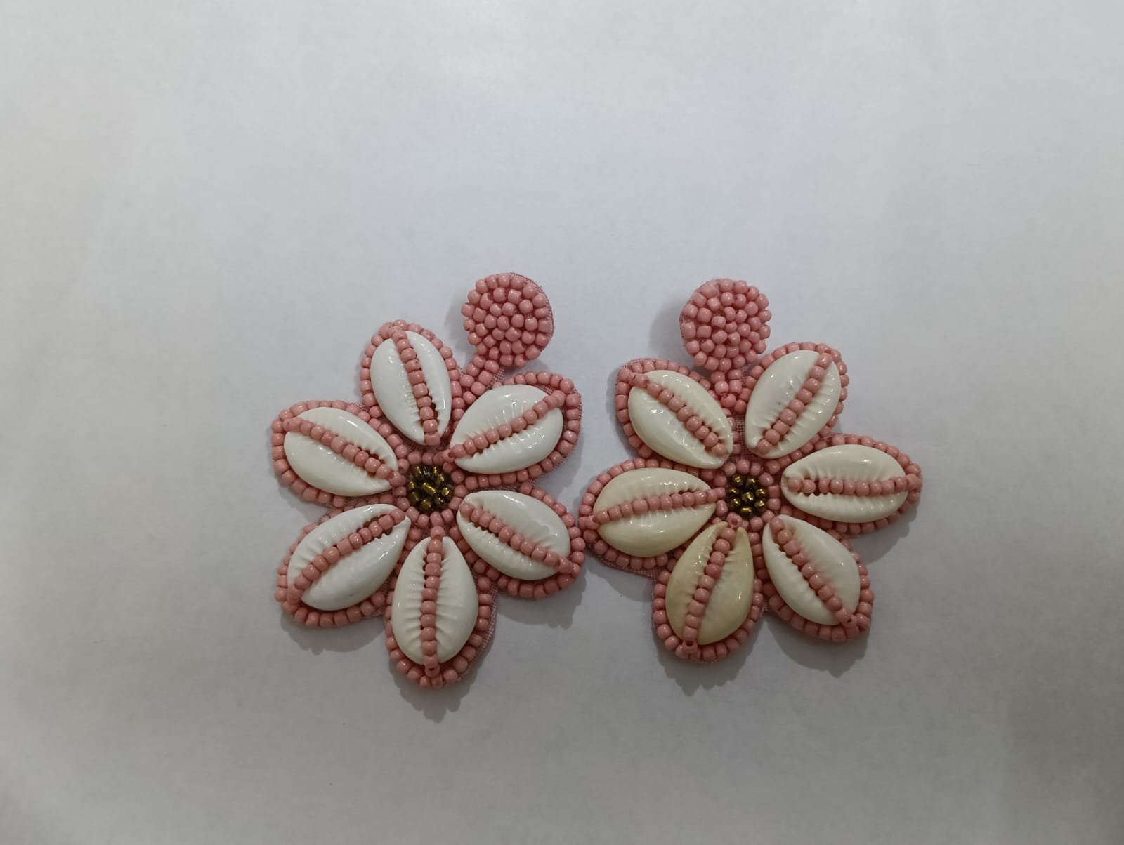 These stunning handcrafted earrings feature a unique floral design, meticulously crafted from genuine white cowrie shells that serve as the delicate petals. Each shell is accented by a vibrant border of soft pink seed beads, creating a beautiful contrast that captures the essence of bohemian elegance.