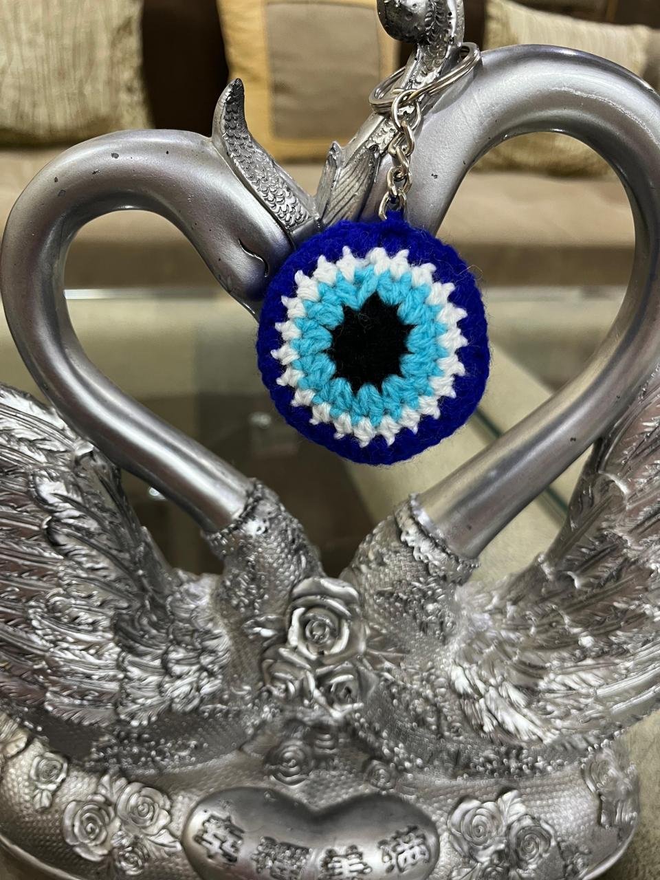 Handmade Crochet Evil Eye Keychain – Protective Blue Yarn Bag Charm | Deepti Handicraft