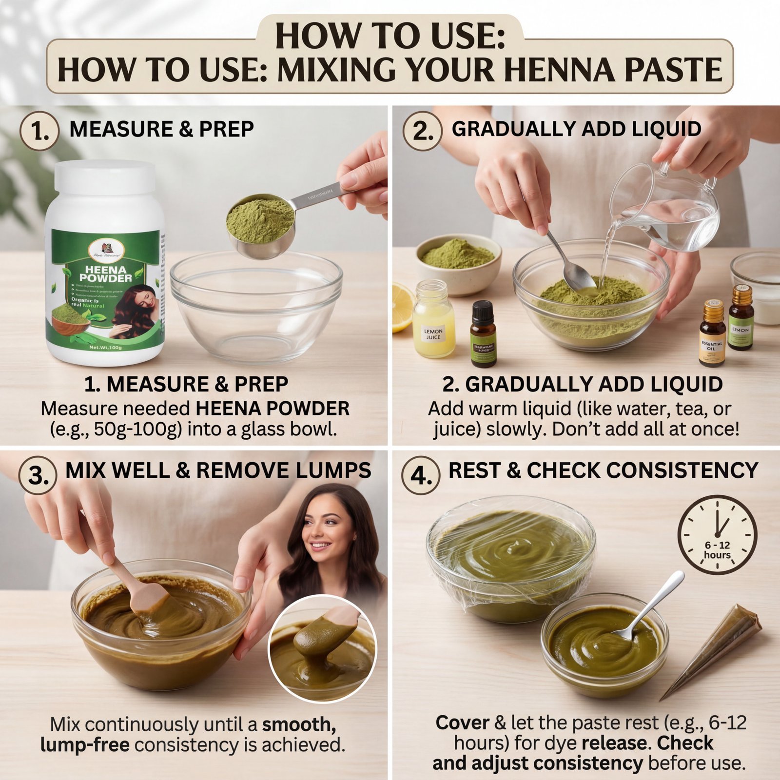 Take 3–4 teaspoons henna powder in a bowl.