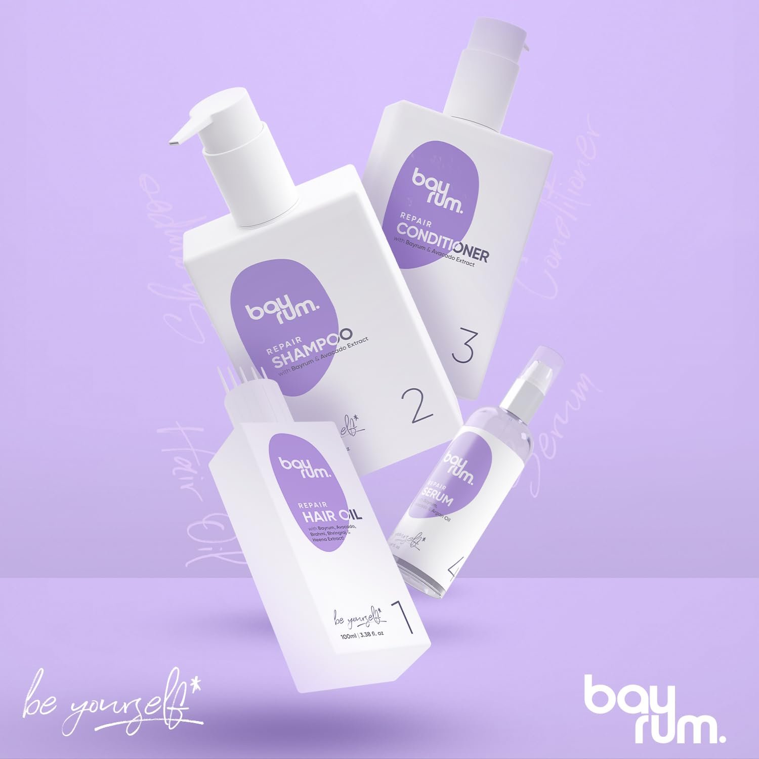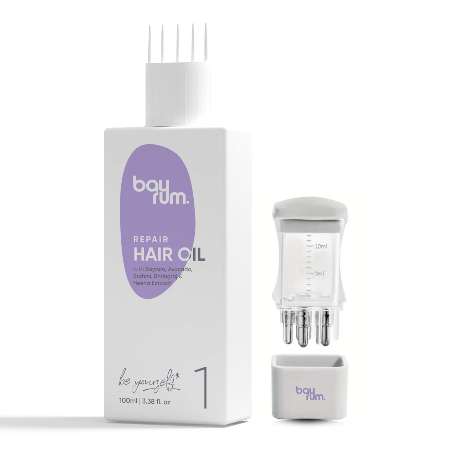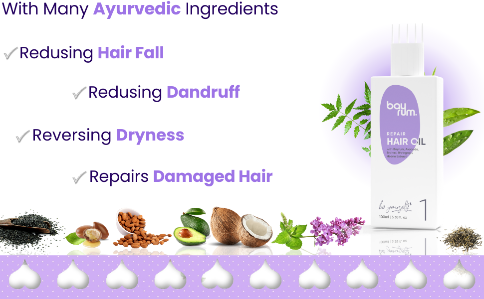 • Our BAYRUM .Repair hair oil is powered with bayrum, Arnica, brahmi, Olive,Til oil, Avocado oil, Jatamasi & Coconut Oils which control hair fall & help to promote hair growth.