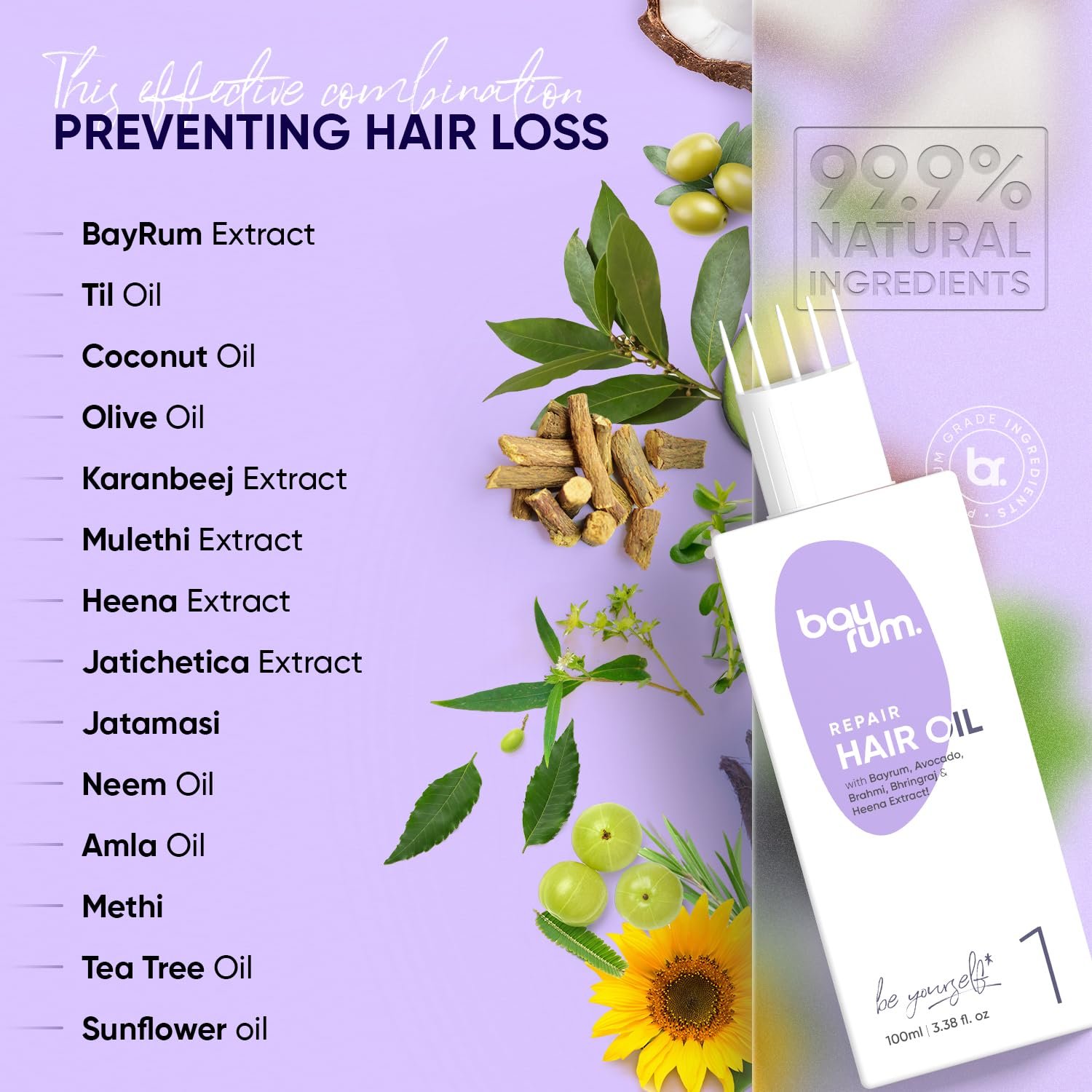 • Our Bayrum hair oil has 99.9% natural hand-picked ingredients that are known to reduce hair fall.