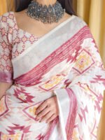 Elegant White and Pink Pure Cotton Linen Saree with Intricate Floral and Geometric Border Design and Tassels on Edges | Crown fashion
