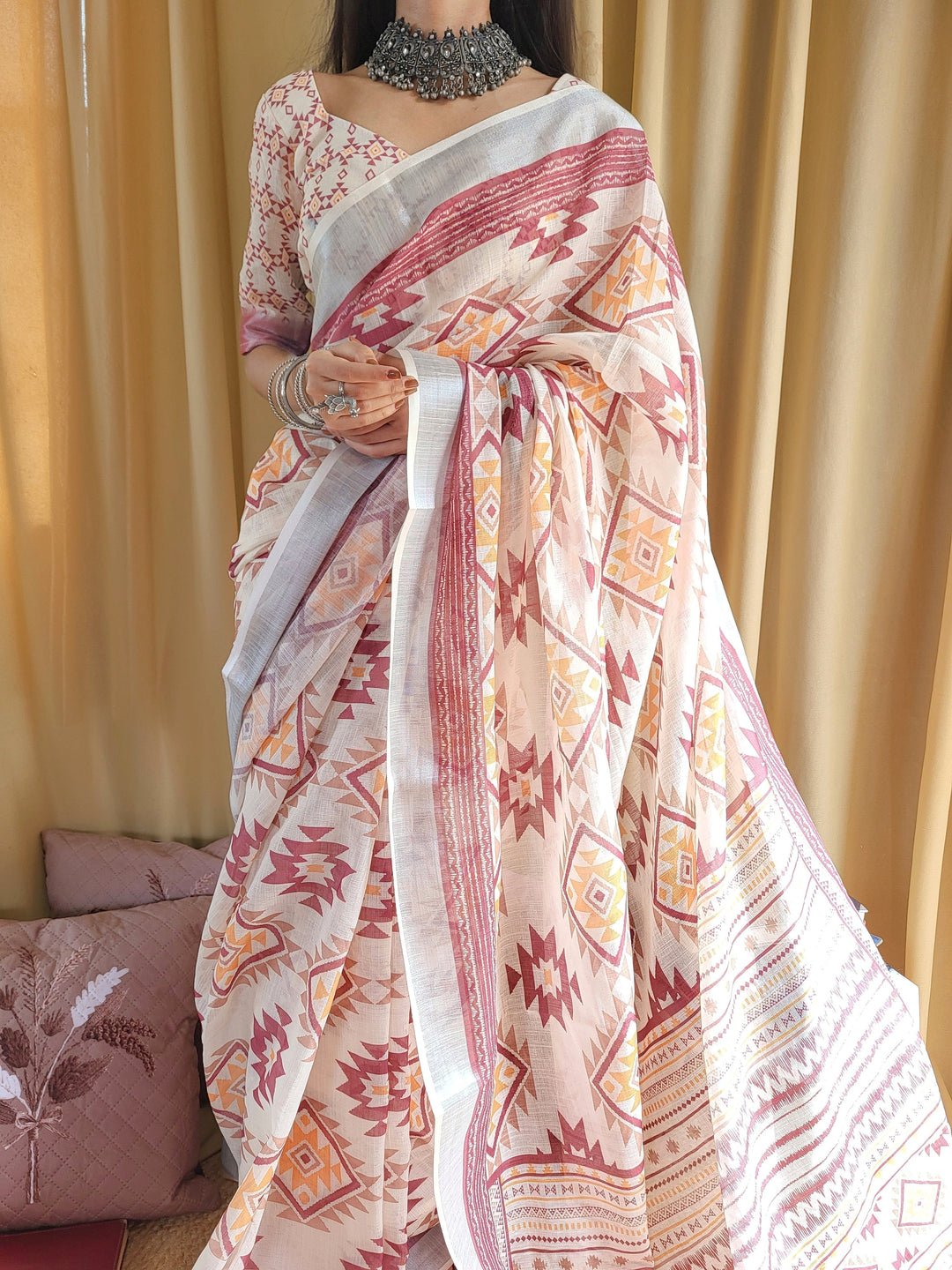 Ivory Linen Saree with Geometric Tribal Prints & Tassel Accents | Crown Fashion