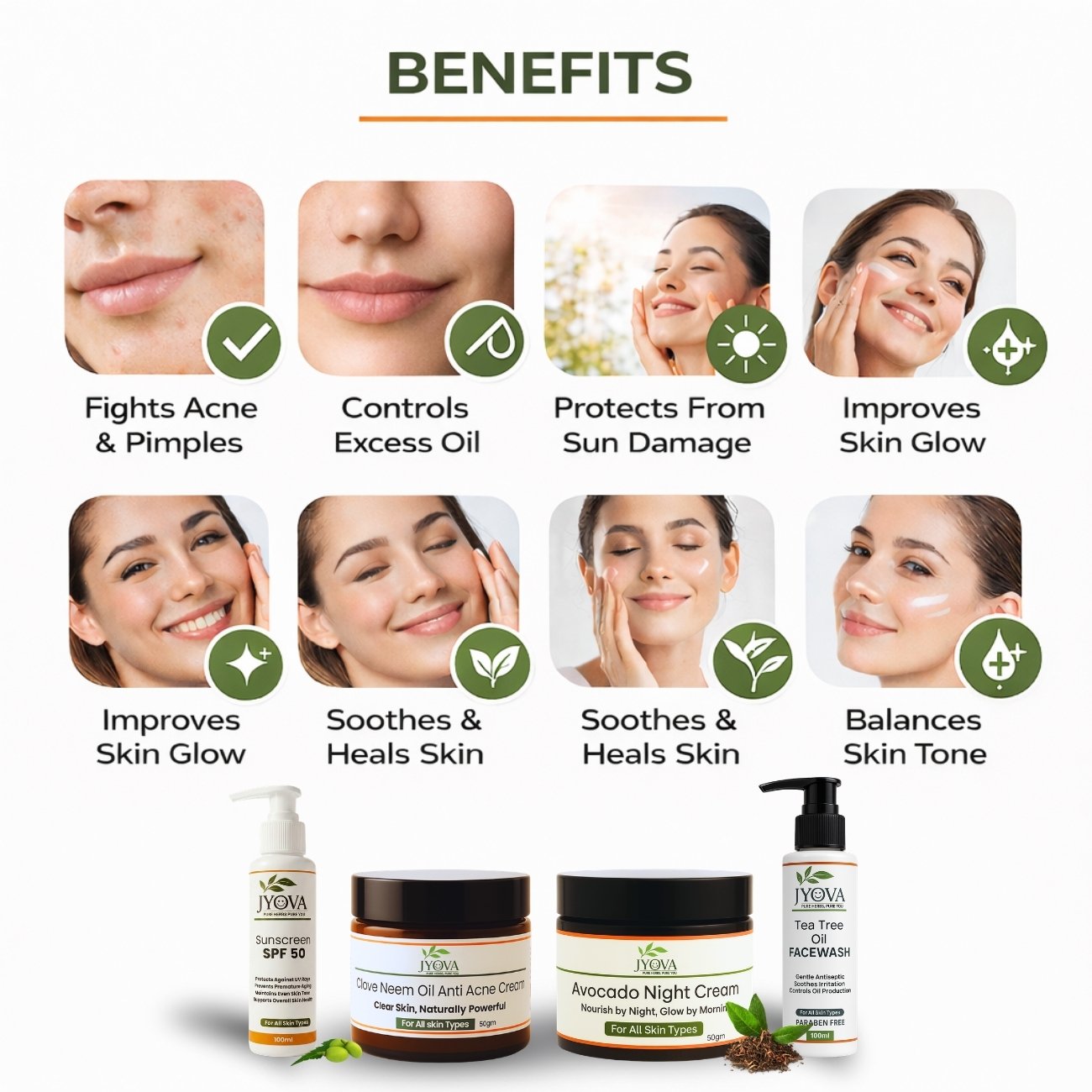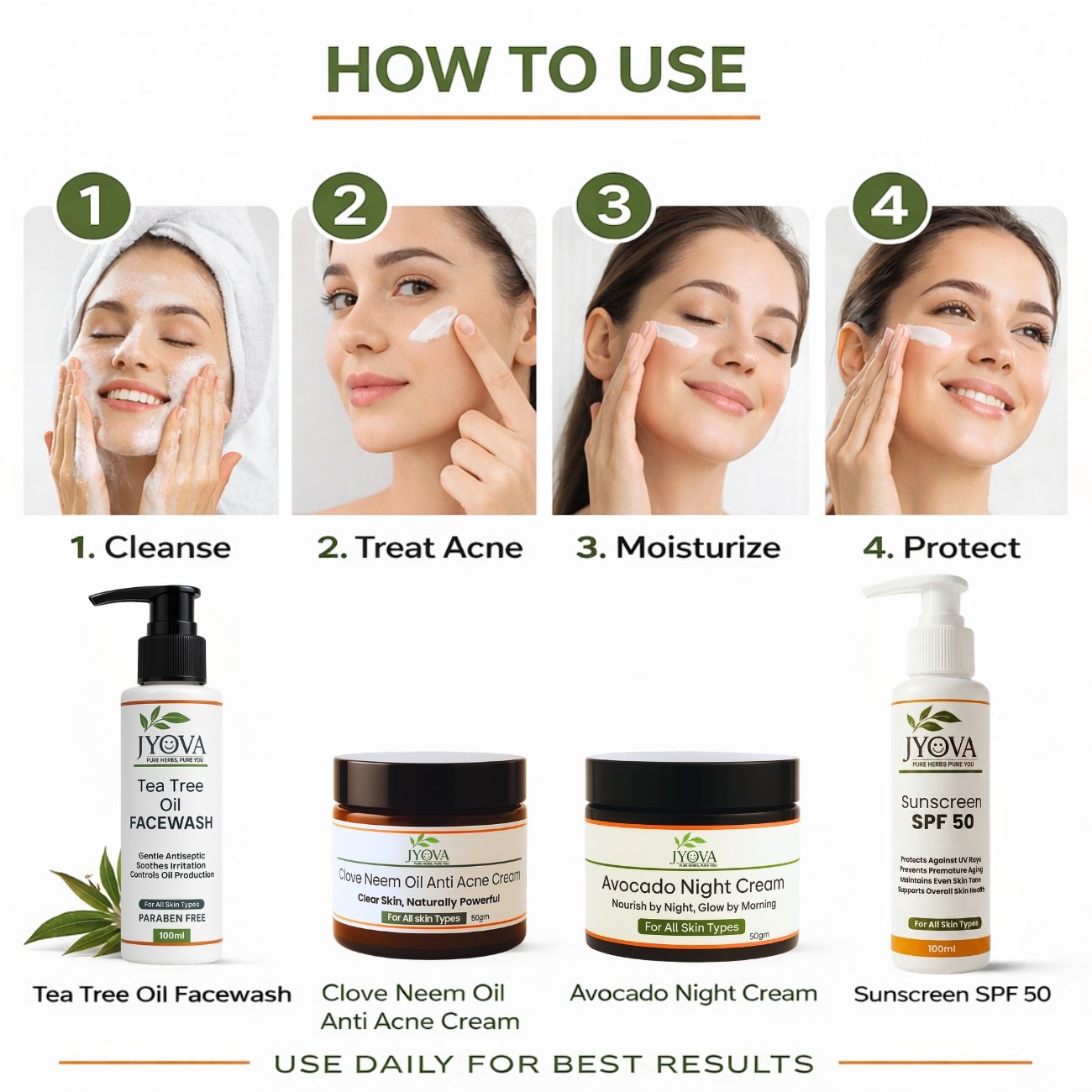 Jyova Anti Acne Skincare Combo – Tea Tree Facewash, SPF 50 Sunscreen, Avocado Night Cream & Clove Neem Anti Acne Cream | Oil Control, Pimple Removal & Clear Skin | For All Skin Types