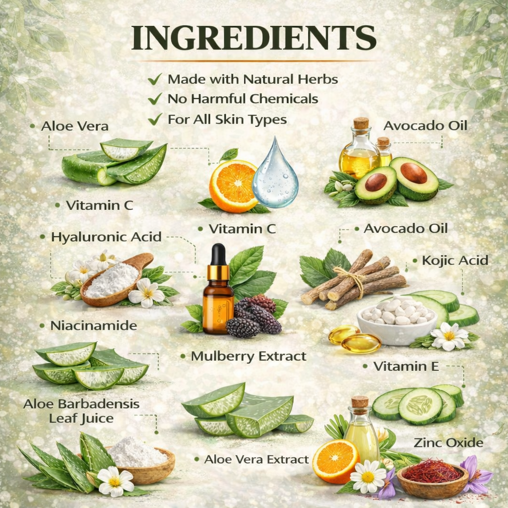 Each product is enriched with powerful ingredients like Vitamin C, Hyaluronic Acid, Niacinamide, Aloe Vera, Kojic Acid & Avocado Oil, designed to repair, protect, and enhance your skin naturally.