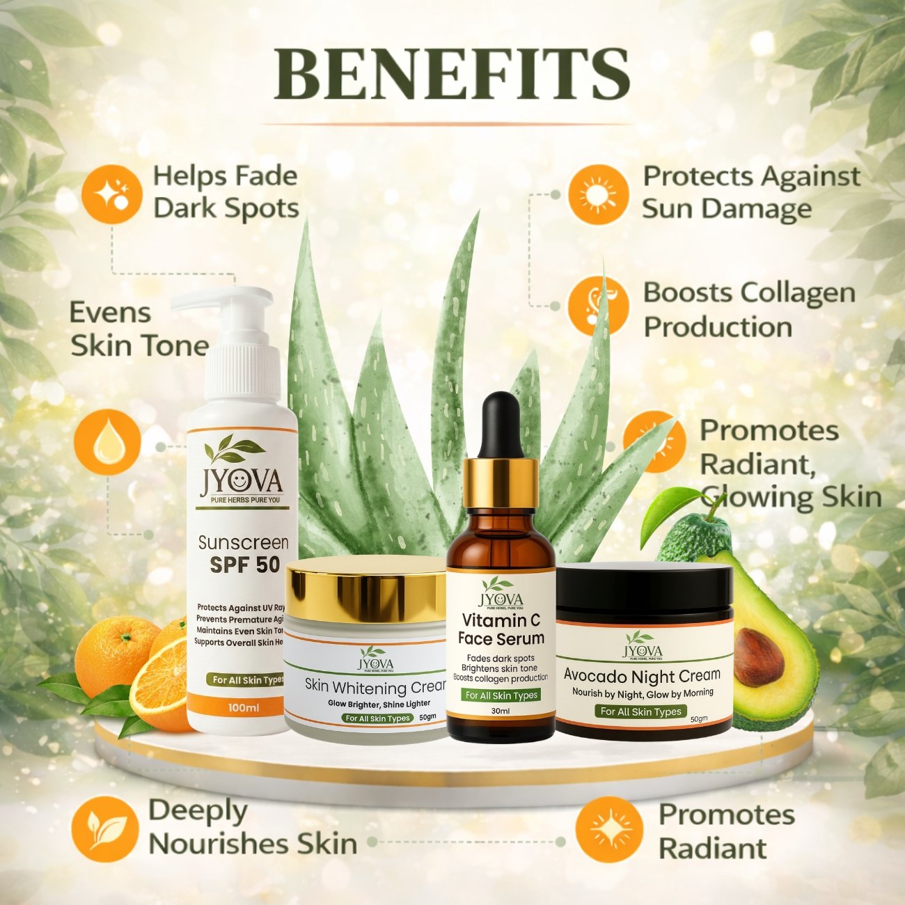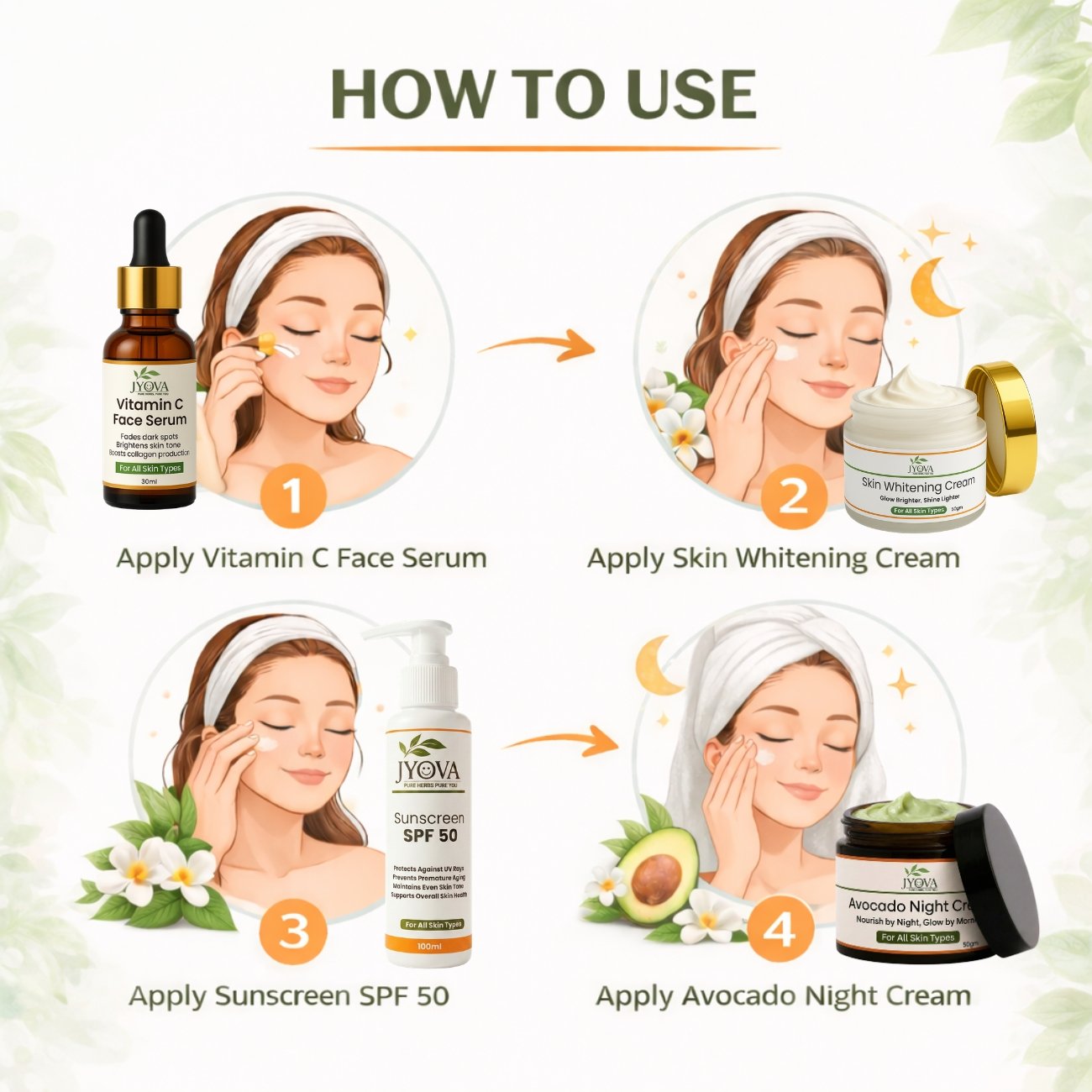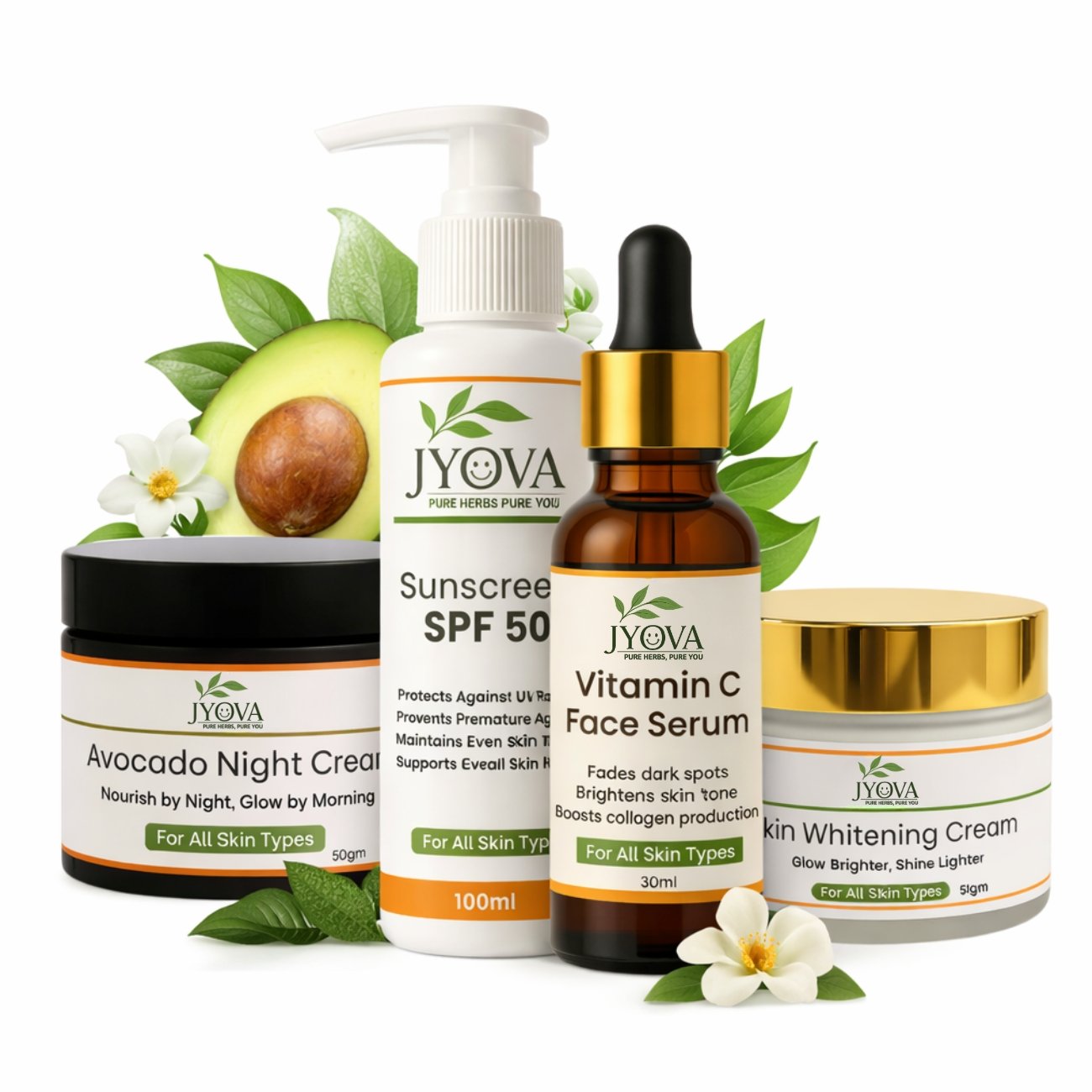 Jyova Natural Skincare Combo – Vitamin C Face Serum, SPF 50 Sunscreen, Avocado Night Cream & Skin Whitening Cream | Brightening, Anti-Aging & Hydration | For All Skin Types