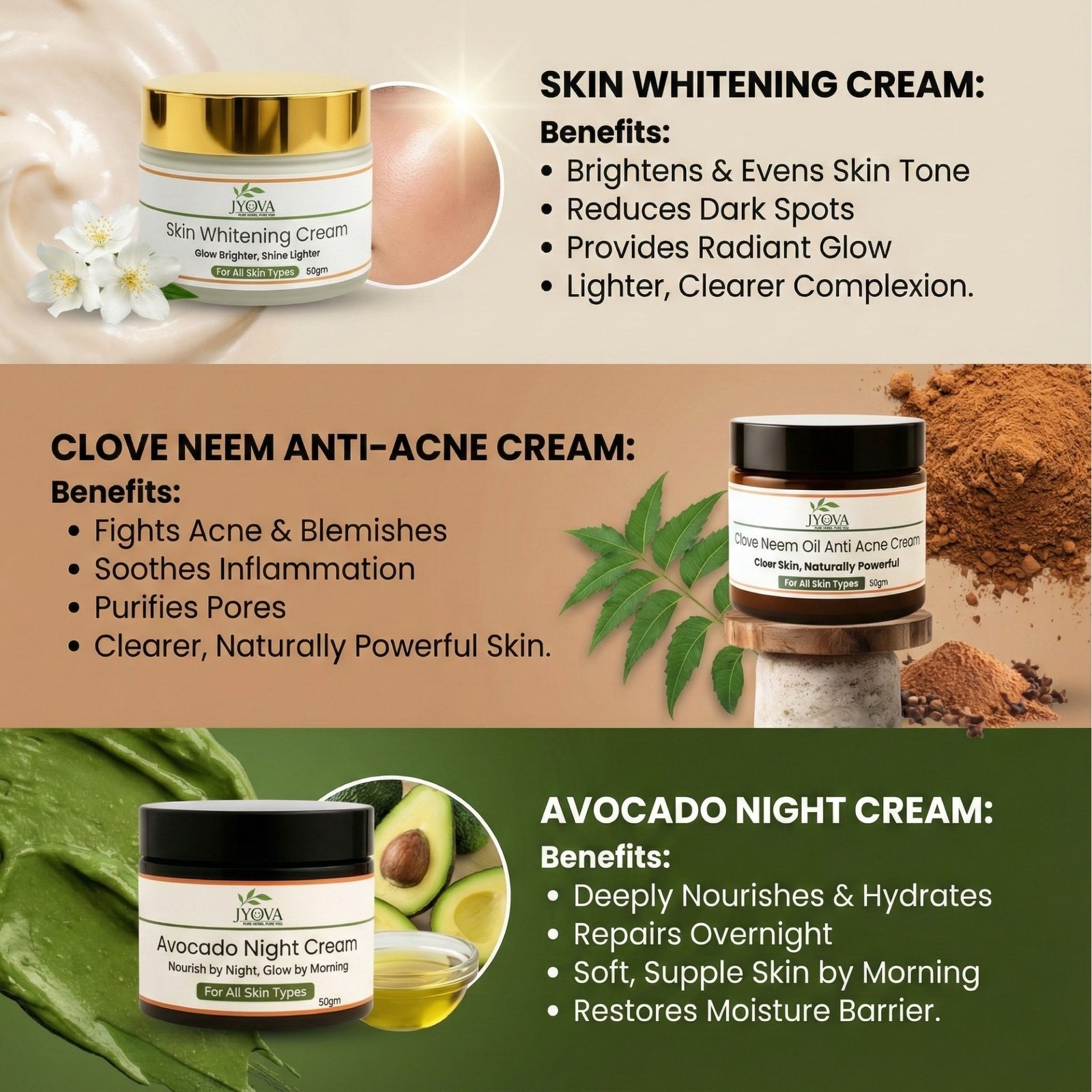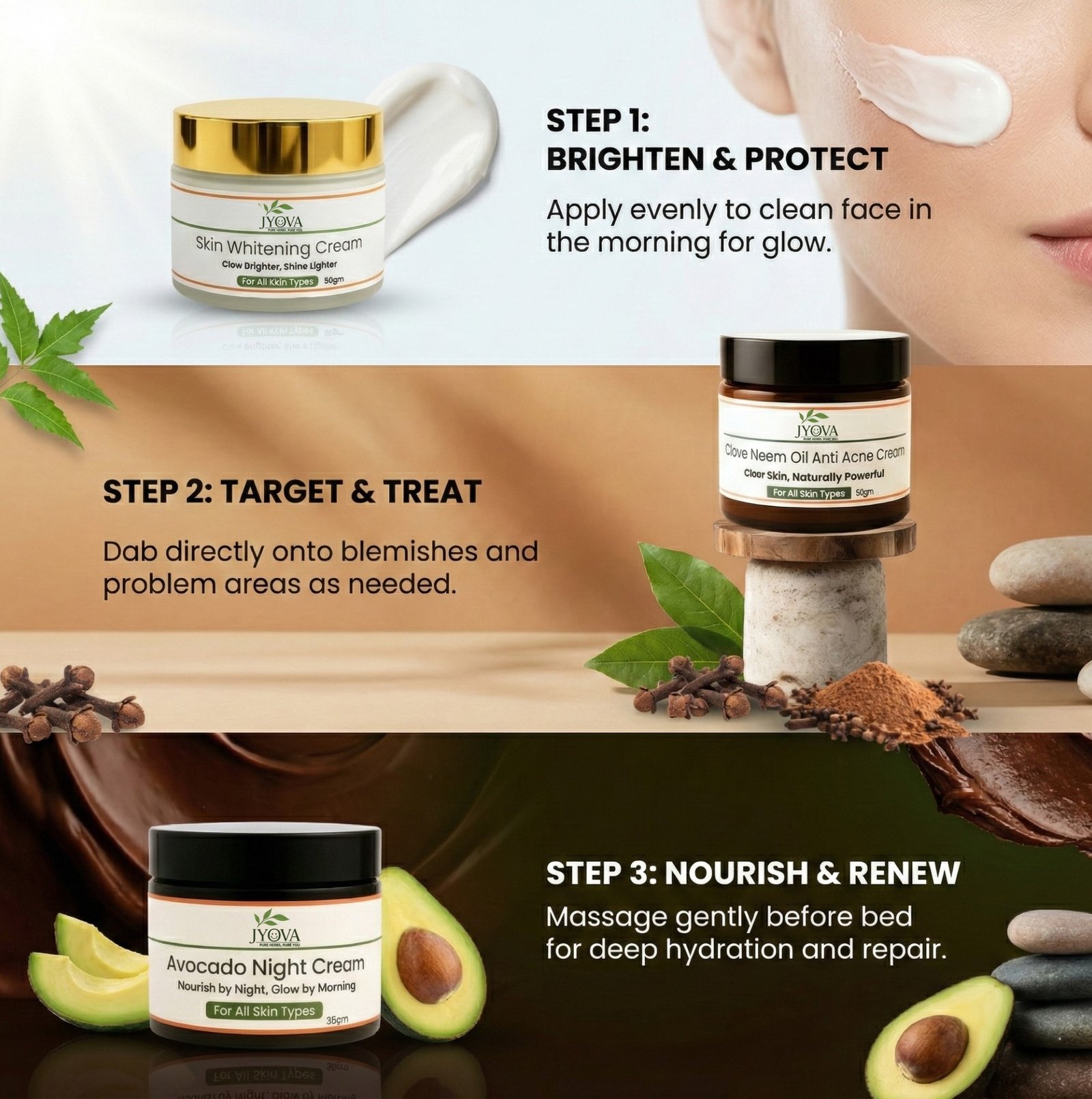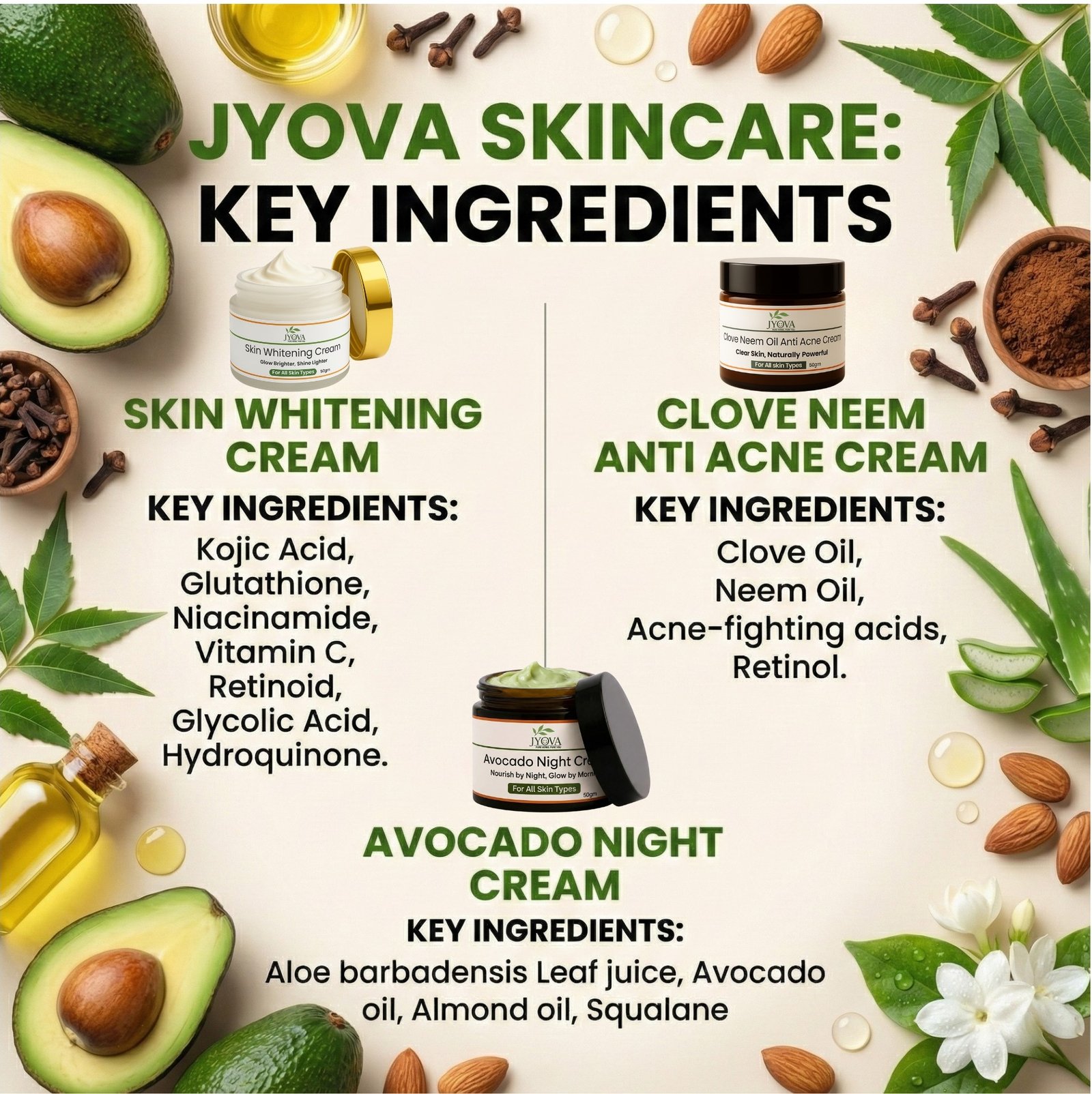 Jyova Skincare Combo – Skin Whitening Cream, Clove Neem Anti Acne Cream & Avocado Night Cream | Brightening, Acne Control & Deep Nourishment