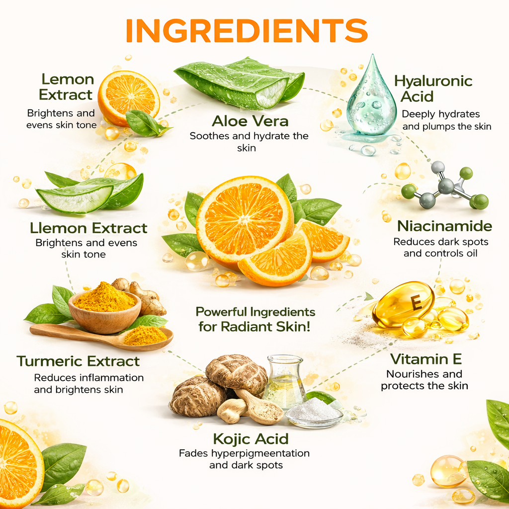 Packed with powerful ingredients like Vitamin C, Lemon Extract, Aloe Vera, Hyaluronic Acid, Niacinamide, Kojic Acid & Turmeric Extract, this combo works deeply to repair skin damage, reduce dullness, and restore natural radiance.