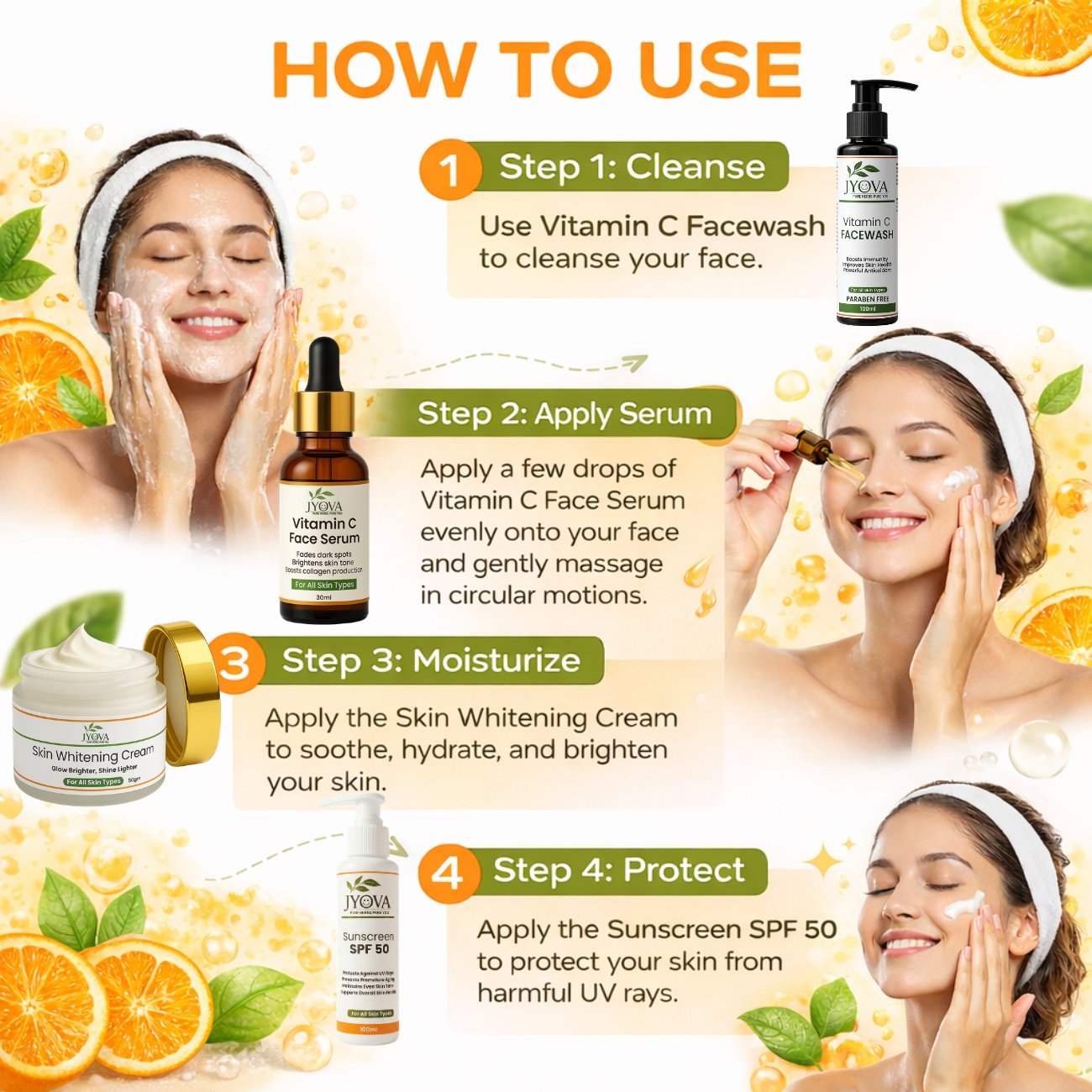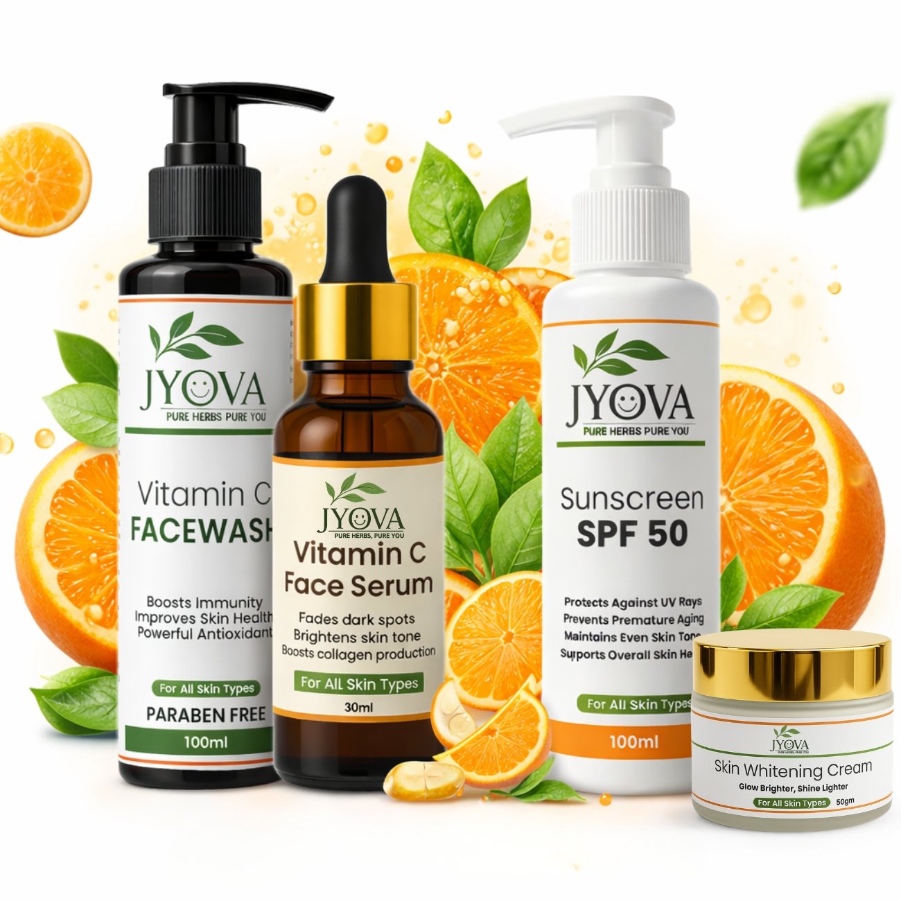 Jyova Vitamin C Skincare Combo – Facewash, Vitamin C Serum, SPF 50 Sunscreen & Skin Whitening Cream | Brightening, Dark Spot Removal & Glowing Skin | For All Skin Types