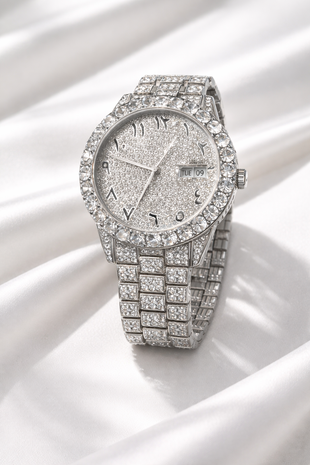 The gold-finished metal bracelet, detailed with precision-set crystals, offers a strong yet comfortable fit on the wrist. Its solid construction ensures durability, while the secure clasp provides confidence throughout the day or night. The watch is carefully balanced to feel premium without being bulky.