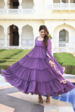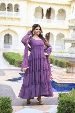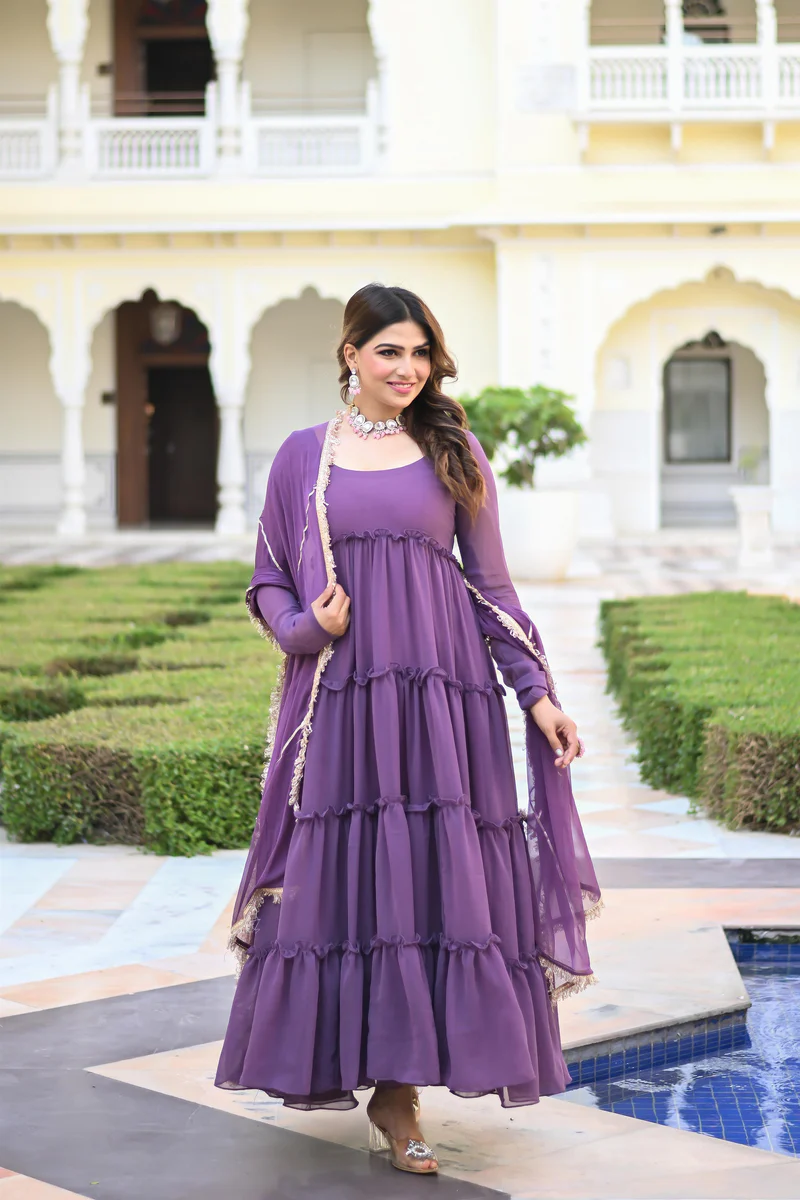 Step into elegance with this beautiful lavender purple layered Anarkali suit set, designed to give a soft and graceful look. The outfit features a multi-layered flared silhouette that adds volume and movement, while the subtle detailing on sleeves and borders enhances its charm. Perfect for both daytime events and festive occasions.