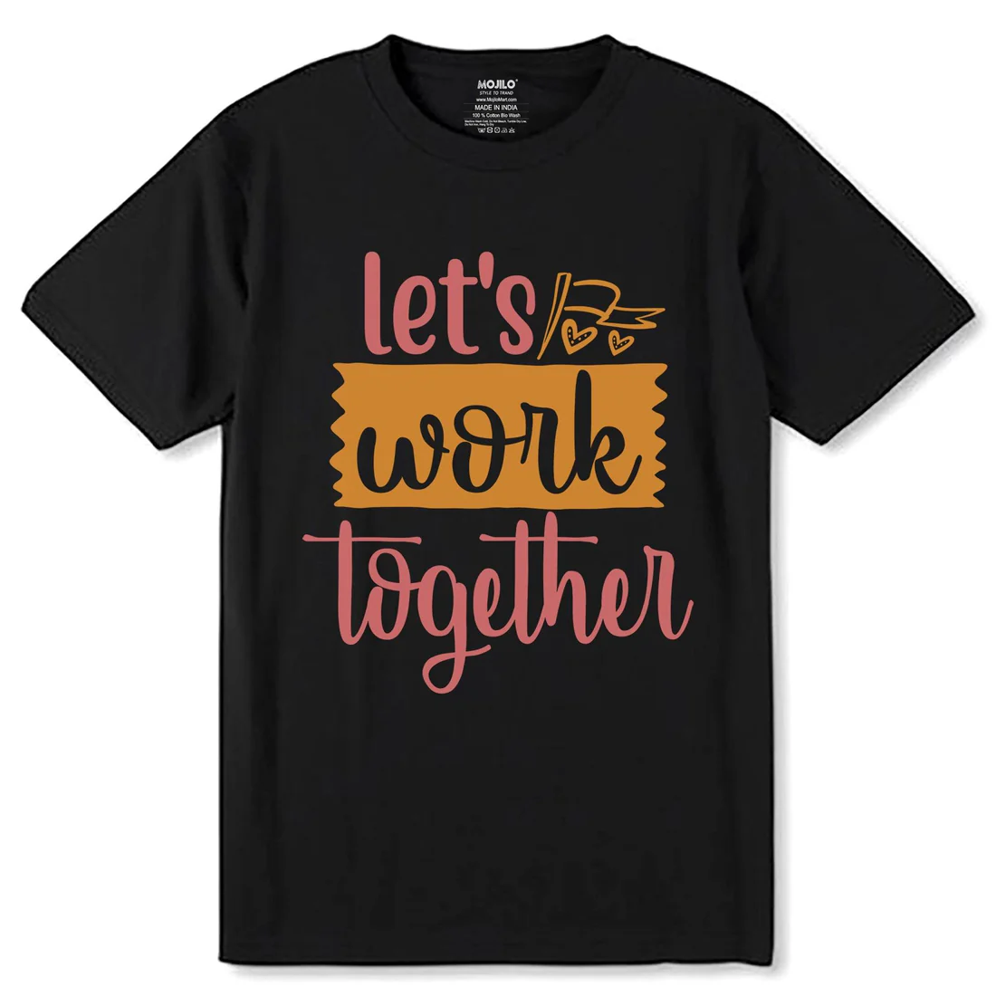 Add a positive and stylish vibe to your casual wardrobe with this black printed T-shirt featuring the “Let’s Work Together” graphic on the front. Designed for everyday comfort, this T-shirt combines a classic look with an expressive quote print that stands out. The soft and breathable fabric helps keep you comfortable all day, while the round neck and half sleeves make it a timeless choice for regular wear. Perfect for casual outings, daily styling, travel, or relaxed weekends.