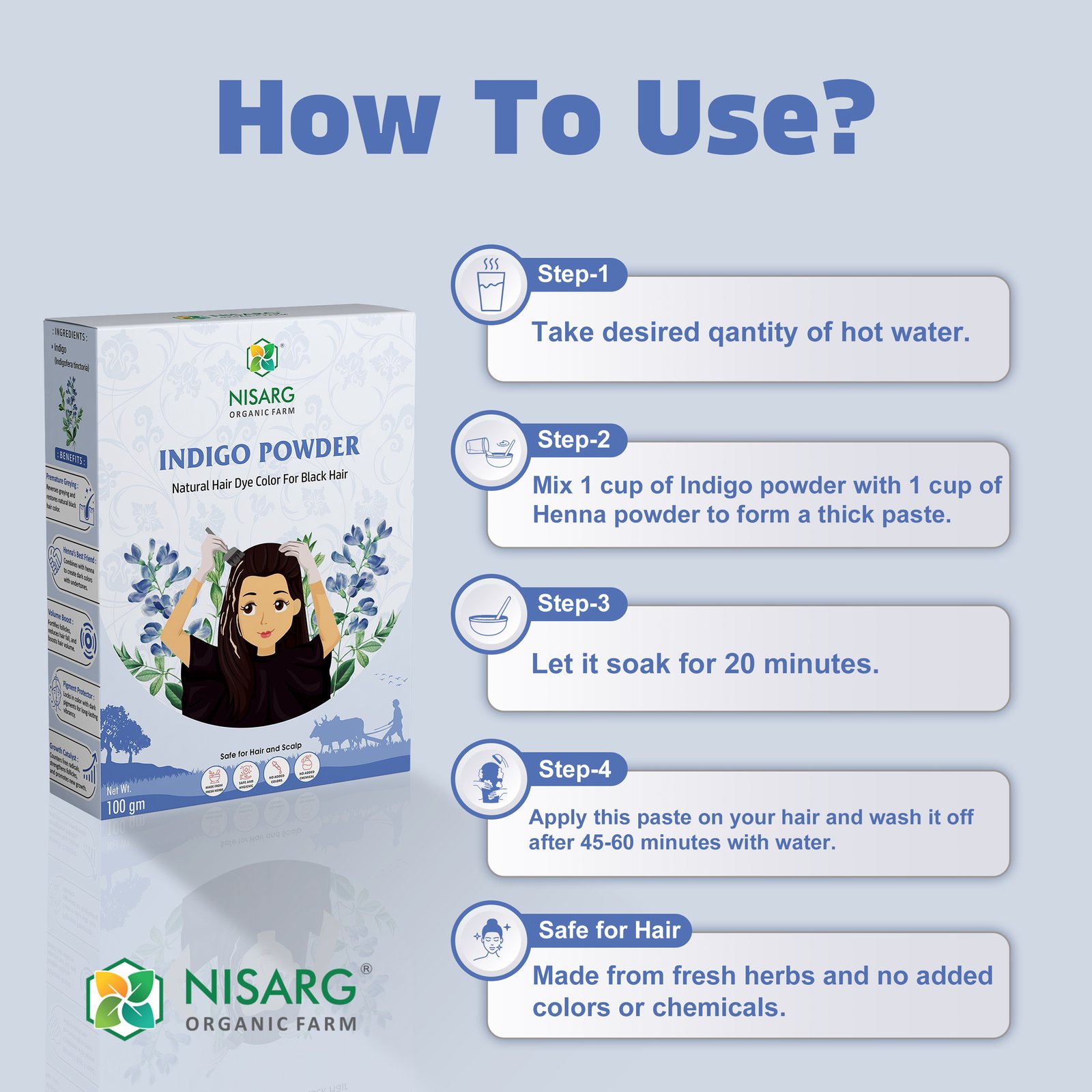 - Indigo Powder: 100% pure and naturally dried indigo leaves, finely ground for optimal use.