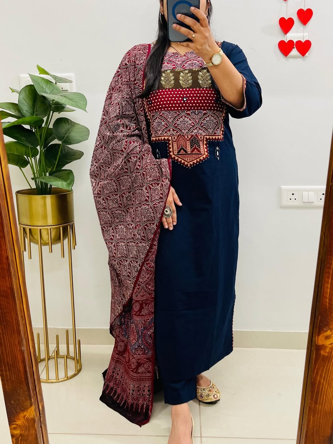 Embrace the timeless artistry of Kutch with our Navy Blue Ajrakh Suit Set. This ensemble features a straight-cut cotton kurta adorned with authentic hand-block geometric motifs. The neckline is highlighted with delicate mirror-work and embroidery, paired with a contrasting maroon Ajrakh dupatta that adds a regal touch to your ethnic wardrobe.