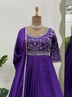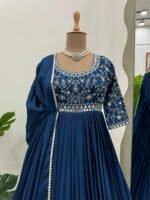 Elegant designer gown set from the premium 5000 Series crafted in luxurious chinon silk fabric featuring intricate thread embroidery with real mirror work. The top is designed to offer a graceful ethnic look with a soft micro inner lining for all-day comfort.