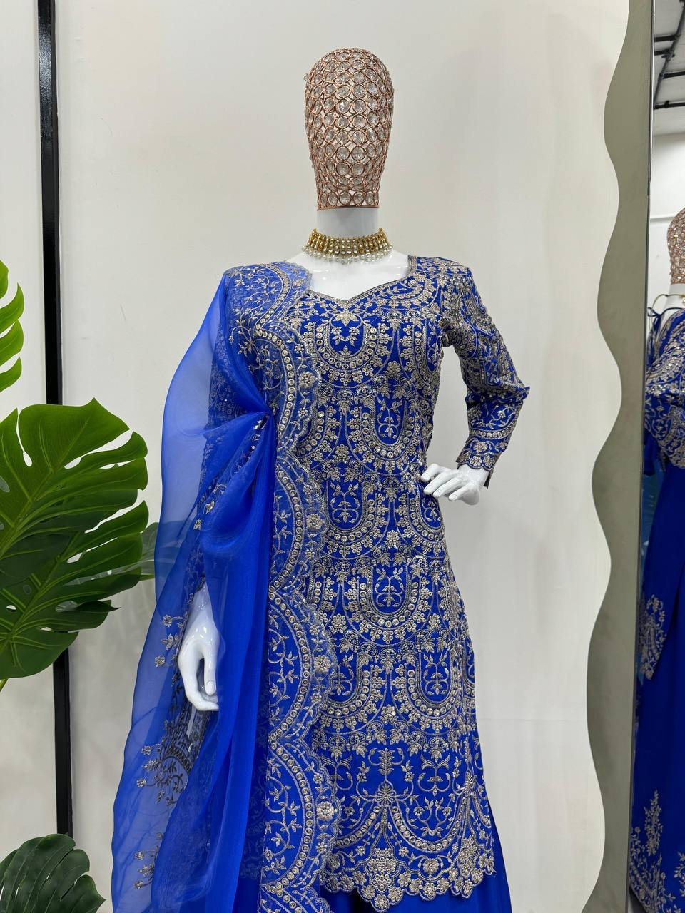 The plazo is fully stitched with elastic fitting up to size 44, ensuring ease and comfort. The outfit is paired with a graceful organza dupatta featuring thread and sequence work with four-side cutwork lace border, enhancing the festive appeal. Ideal for weddings, parties, and special occasions.