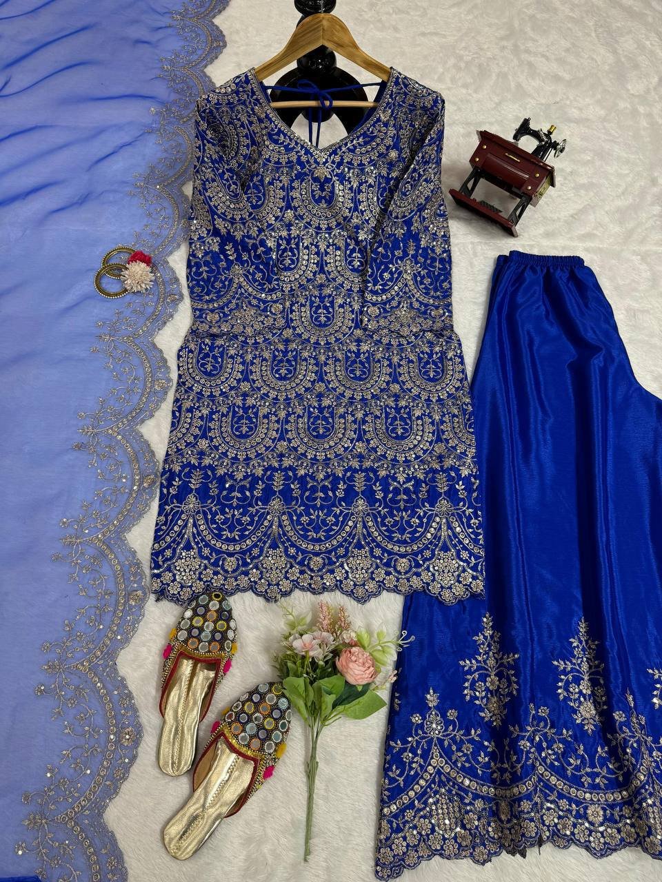 Elegant designer plazo set from the premium 5000 Series crafted in rich chinon silk fabric with detailed thread and sequence embroidery work. The top features a stylish back dori with work, adding a modern designer touch along with a comfortable micro inner lining.