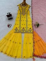 Premium designer sharara set from the 5000 Series crafted in elegant faux georgette fabric with detailed thread and sequence embroidery work. The top is designed with a soft micro inner lining and comes in multiple stitched sizes with XXL margin for better fitting.