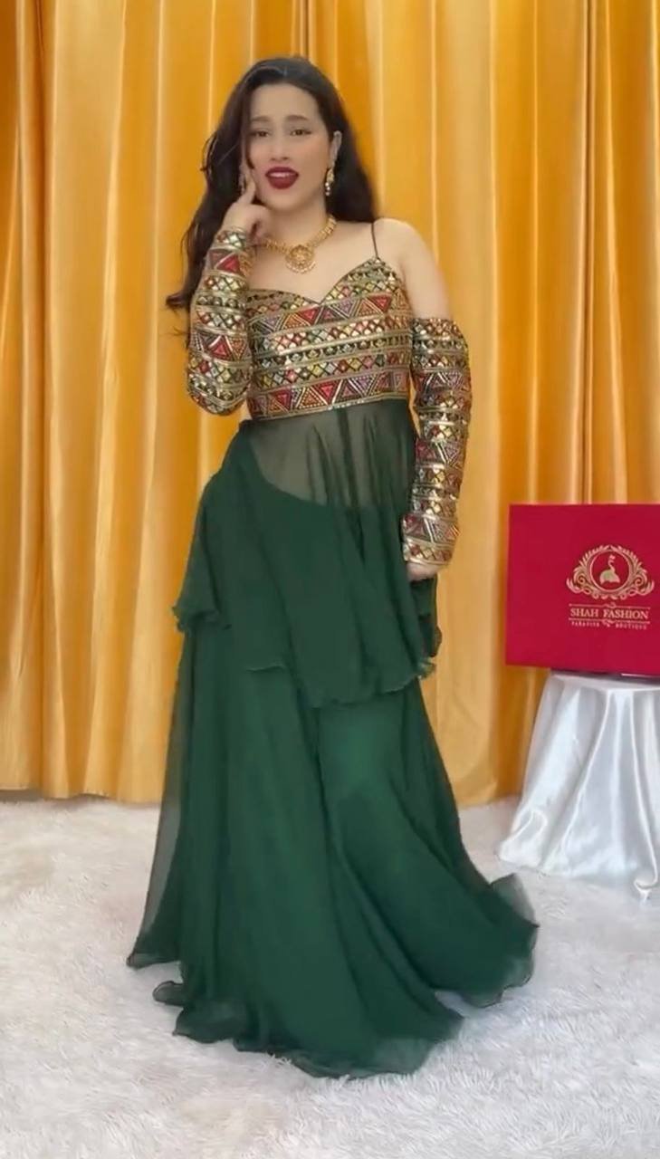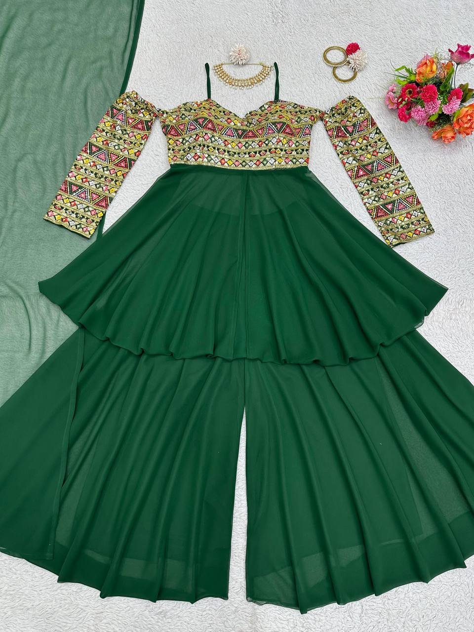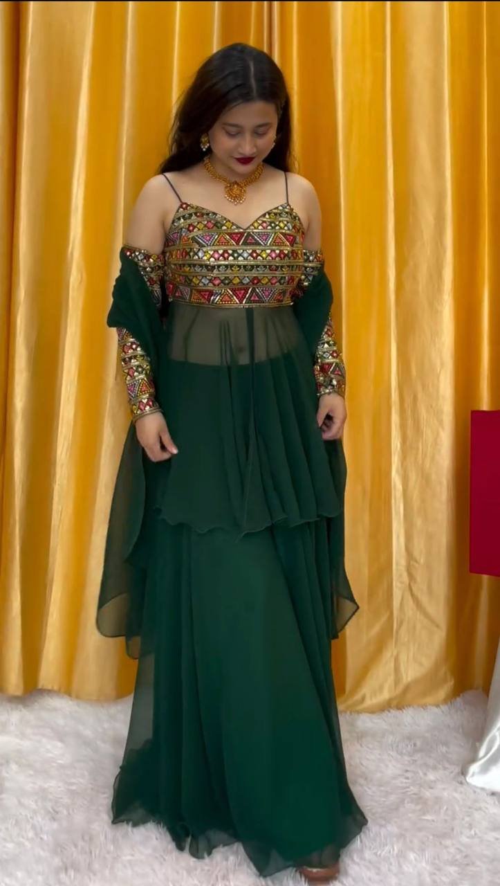 Presenting a premium 5000 Series designer sharara set crafted with elegant faux georgette fabric and detailed thread with sequence embroidery work. The top is designed with soft micro inner lining for comfort and perfect fall. The plazo comes fully stitched with elastic fit up to size 42, ensuring easy wear and flexibility. Paired with a lightweight 2.2-meter dupatta, this outfit delivers a complete ethnic look suitable for festive wear, parties, and special occasions.