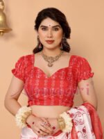 • Blouse: 0.8-meter unstitched blouse in matching red with motif design