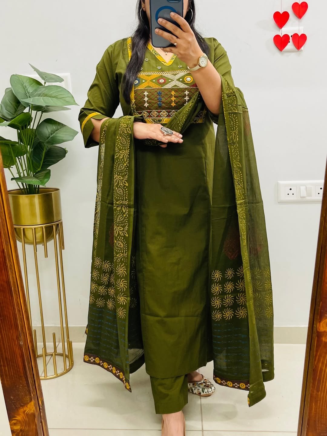 Olive Green 3-Piece Set with Traditional Sun-Motif Dupatta | Komal Collection