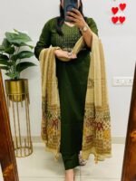 Be the first to review “Olive Green Embroidered Cotton Suit with Patchwork-Style Mosaic Dupatta | Komal Collection” Cancel reply