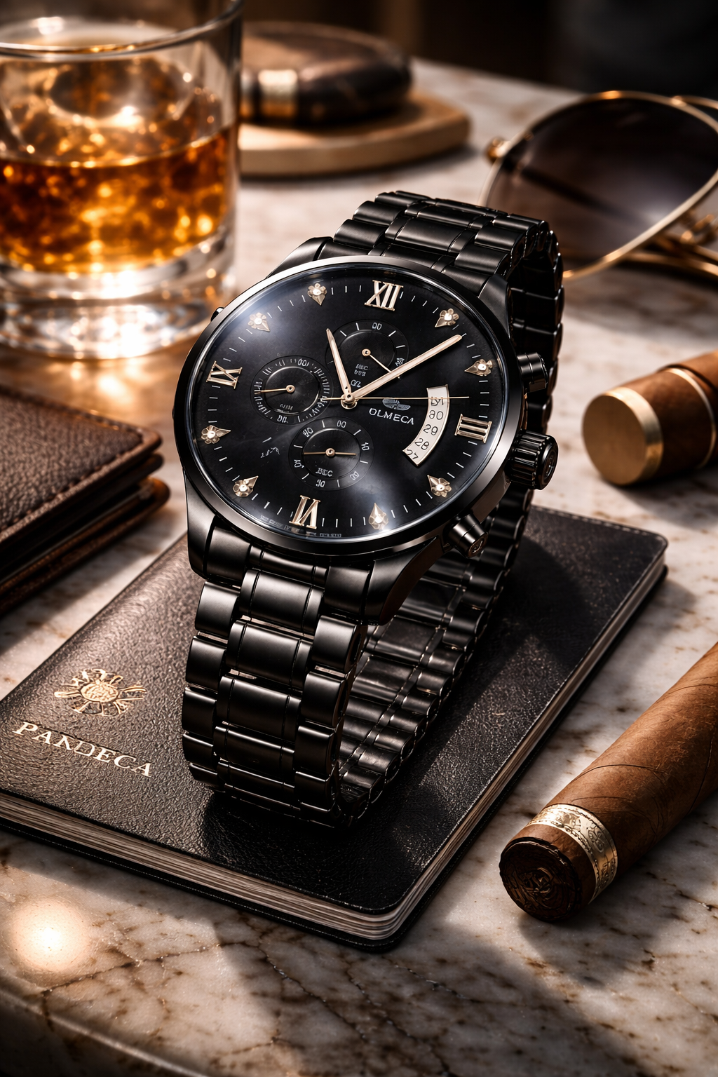 The OLMECA Chronograph Watch is a refined blend of premium aesthetics and precise functionality, designed for customers who appreciate both style and performance. The watch features a sophisticated silver dial with gold-tone hands, applied Roman numerals, and crystal-style hour markers that enhance its luxury appeal.