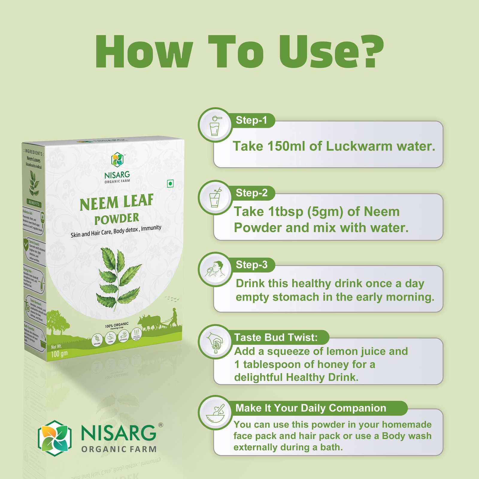 - Neem Leaves (Azadirachta indica): 100% pure and natural, carefully dried and powdered to retain maximum nutrients and benefits.