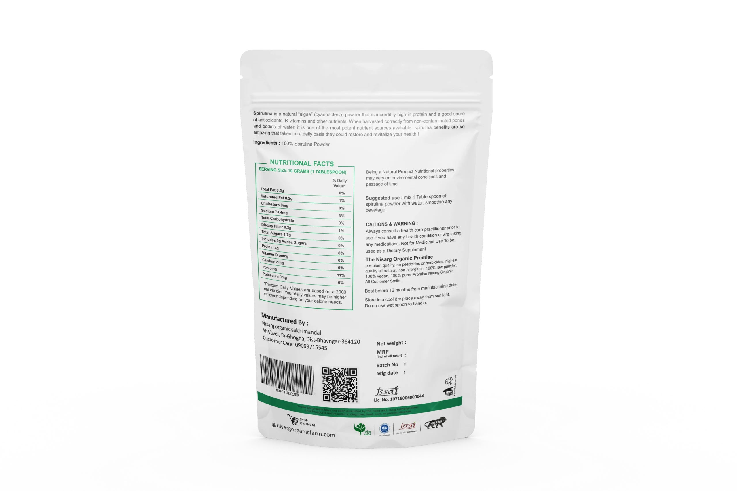 At Nisarg Organic Farm, our Organic Spirulina Powder is cultivated with care using pure, chemical-free methods to deliver unmatched quality and nutrition. Rich in plant-based protein, iron, B12, and antioxidants, spirulina is a natural energy booster that supports immunity, detoxification, and overall vitality. We sun-dry our spirulina to preserve its nutrients and vibrant green color without using artificial heat or preservatives.