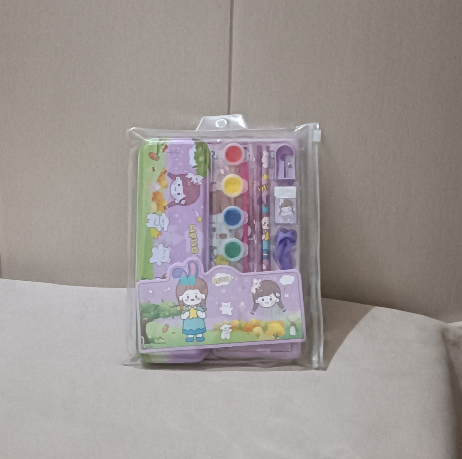 This Stationery Kit Contains different stationery includes (1-Coloring Book, 1 Box, 1 Painting Colour, 1 painting brush, 1 eraser, 1 shapner, and 2 pencil). This is very useful kit for the children.