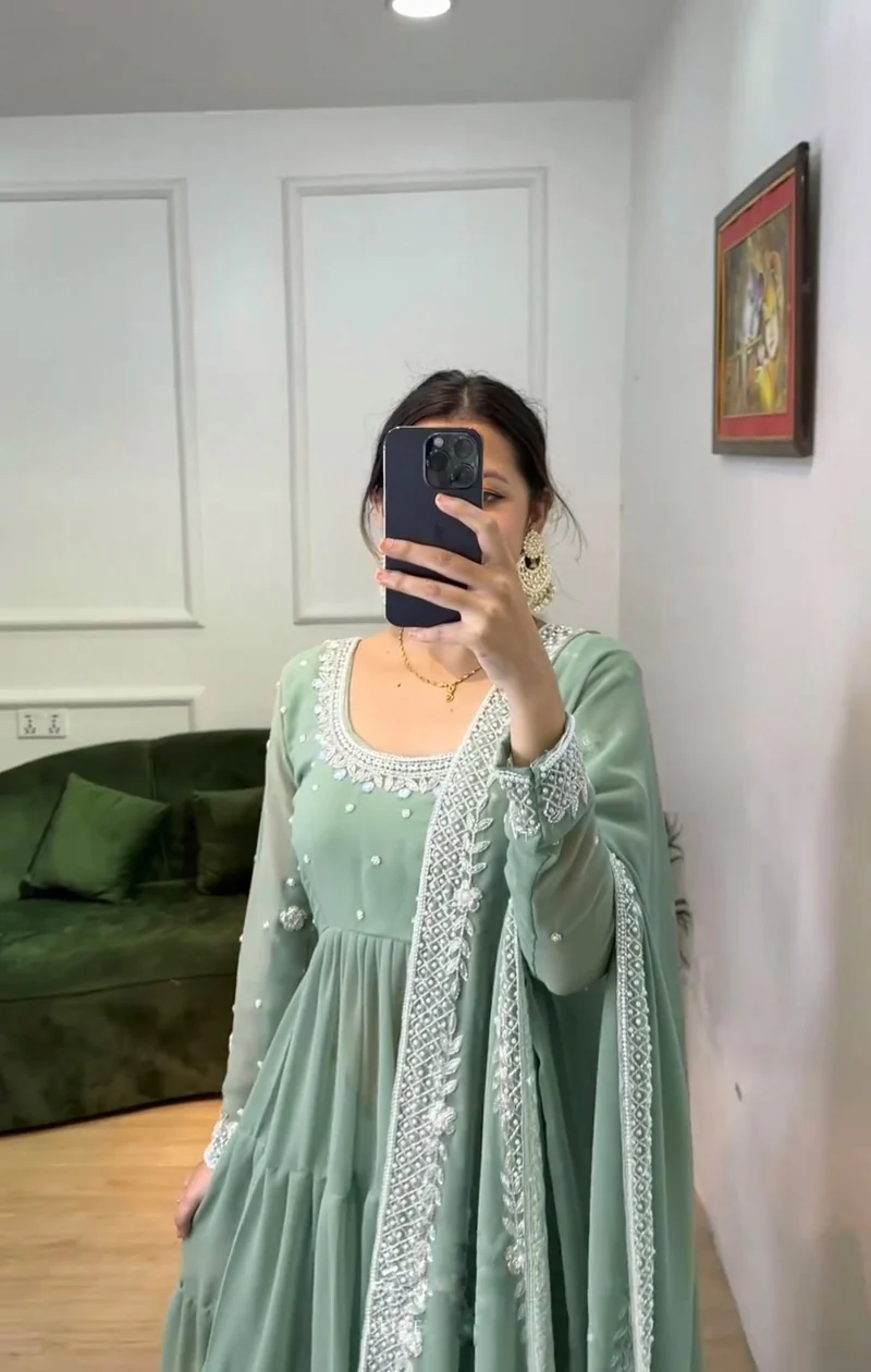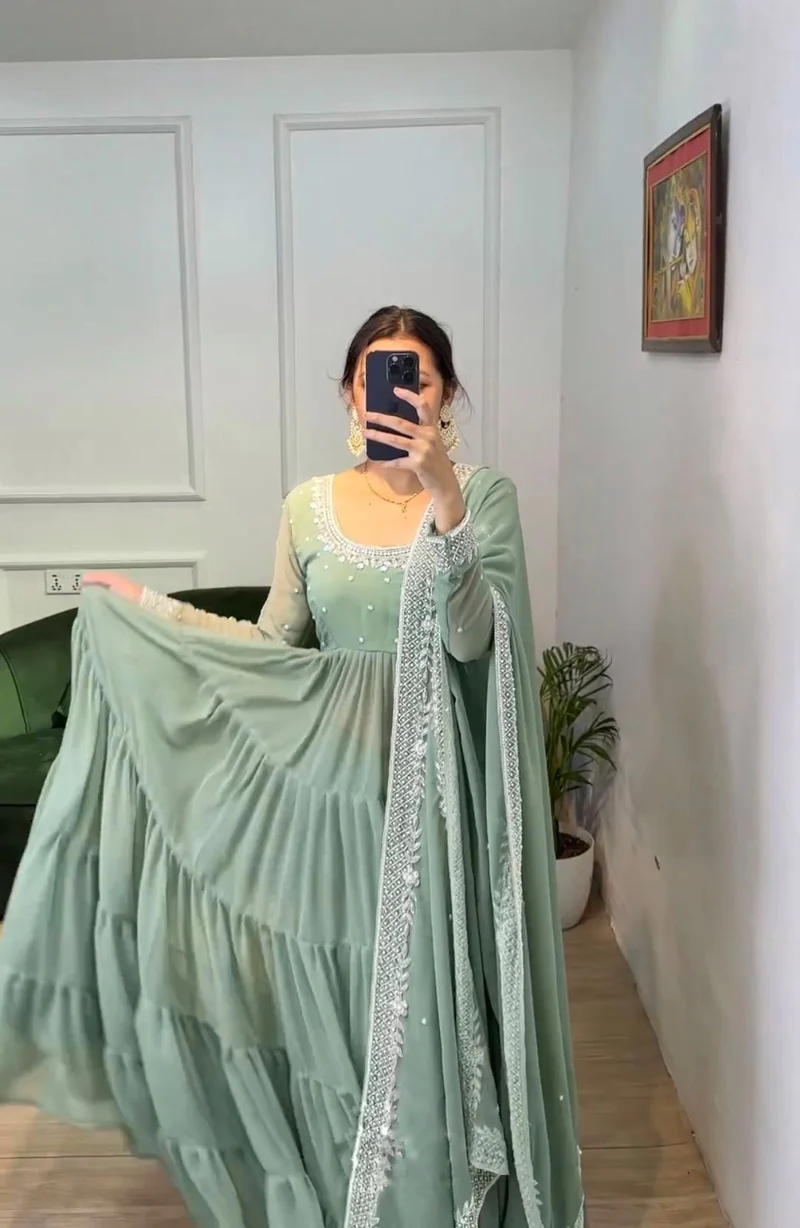 This Anarkali set is perfect for women who love subtle pastel tones with elegant detailing. The soothing pastel green shade gives a fresh and classy appearance, ideal for daytime events, festive gatherings, and celebrations.