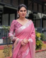 Be the first to review “Pink Pure Cotton Linen Saree with Floral and Nature Print, Silver Border & Tassels | Crown Fashion” Cancel reply