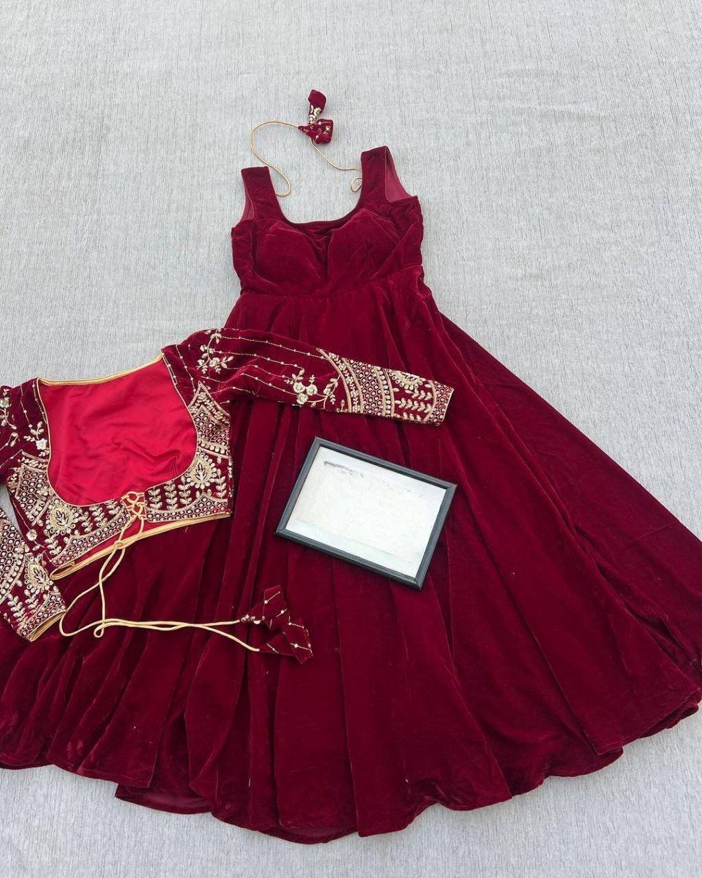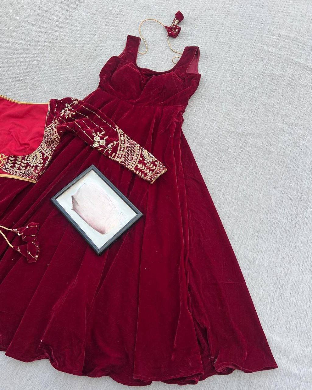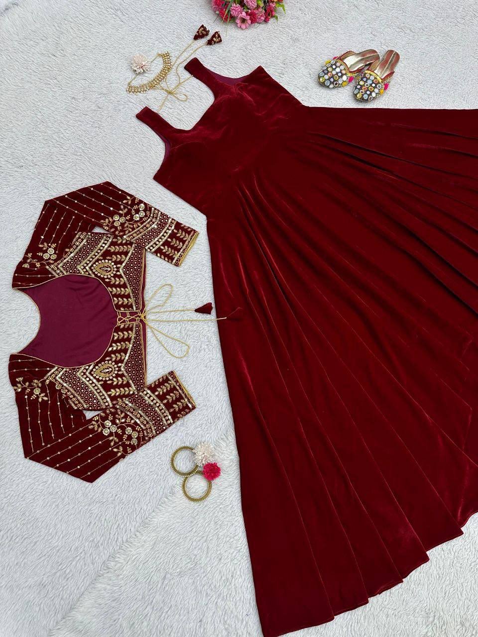Elevate your ethnic wardrobe with this luxurious 9000 Velvet Anarkali Suit Set. Designed with rich velvet fabric and elegant thread with sequins work, this outfit offers a royal and premium festive look.