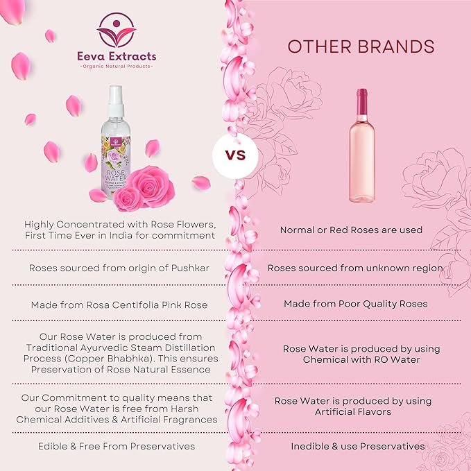 Premium Quality: Our rose water is steam distilled from fresh rose petals, ensuring the highest quality and purity without any additives or preservatives.