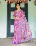 Purple and Pink Floral Printed Pure Cotton Linen Saree with Blouse and Tassels | Crown Fashion