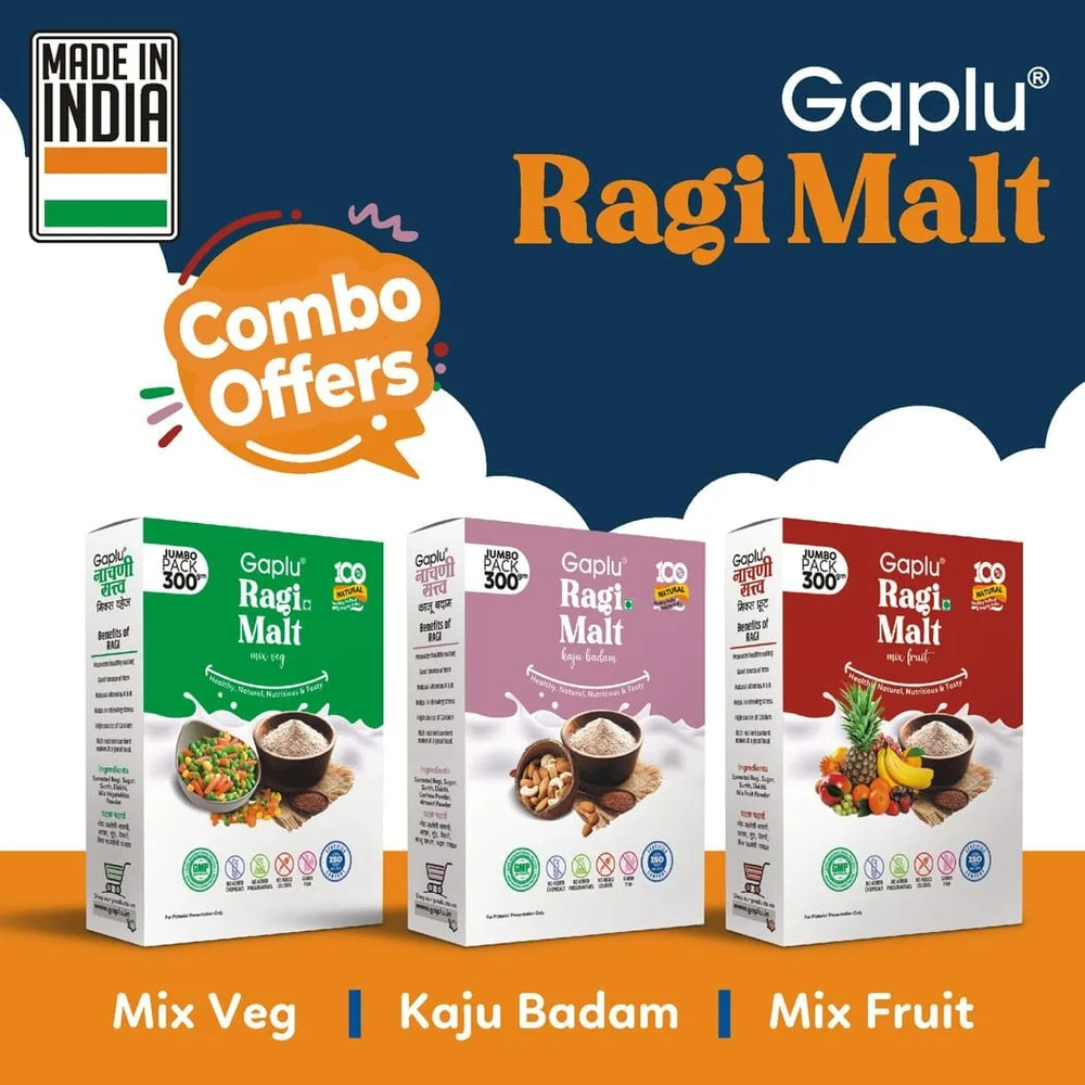 Ragi Malt Combo Pack (Pack of 3) | Mix Veg, Kaju Badam & Mix Fruit | Nutritious Multigrain Health Drink | 300g Each | Gaplu