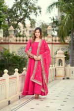 Make a vibrant style statement with this stunning rani pink Anarkali suit set, designed to reflect elegance and charm. The outfit features a beautifully flared kurta paired with a richly embroidered dupatta adorned with intricate zari work and detailed borders. The bold pink hue adds a festive vibe, making it perfect for celebrations and special occasions.