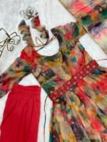 This Anarkali suit is perfect for women who love contemporary ethnic styles with artistic prints. The multicolor design makes it versatile and eye-catching, ideal for daytime events, outings, and light celebrations.