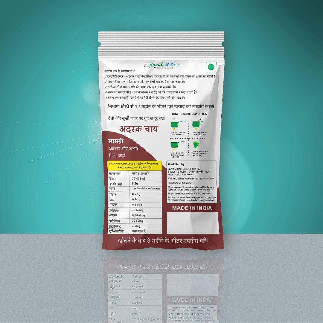 Enjoy the rich and refreshing taste of Rural Mother Adrak Chai, made from premium quality tea leaves blended with natural ginger for a strong, aromatic, and authentic Indian tea experience. This 100% natural and vegan tea delivers a perfect balance of flavor and health benefits. Ginger is known for its soothing properties and helps support digestion, immunity, and relief from cold and cough. Carefully packed to preserve freshness and aroma, this tea is ideal for daily consumption and provides a refreshing start to your day.