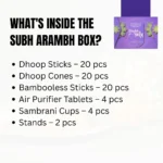 Designed for versatility, the box includes a variety of dhoop sticks, cones, bambooless sticks, sambrani cups, and air purifiers—each crafted to release long-lasting, soothing fragrances that cleanse your surroundings and elevate your mood.