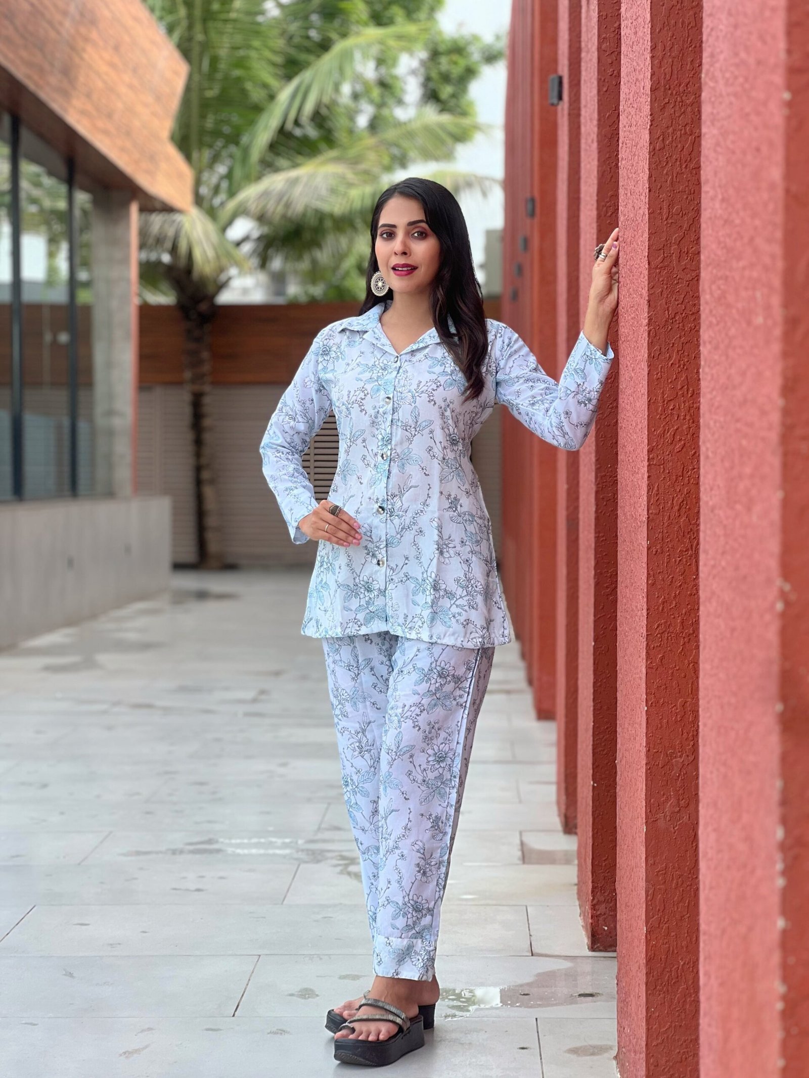 Upgrade your everyday style with this elegant light blue floral printed women’s co-ord set. Designed with a sophisticated shirt-style top and matching straight-fit pants, this coordinated outfit offers both comfort and modern fashion. The soft cotton fabric ensures breathability and ease of movement, making it perfect for all-day wear. The subtle floral pattern adds a graceful and refreshing look, ideal for casual outings, travel, and daily wear.