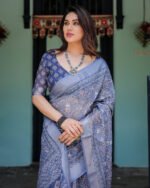 Be the first to review “Steel Blue Pure Cotton Linen Saree with Floral and Geometric Block Print, Blouse, and Tassel Detailing | Crown Fashion” Cancel reply