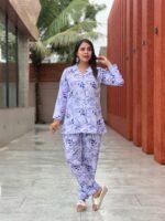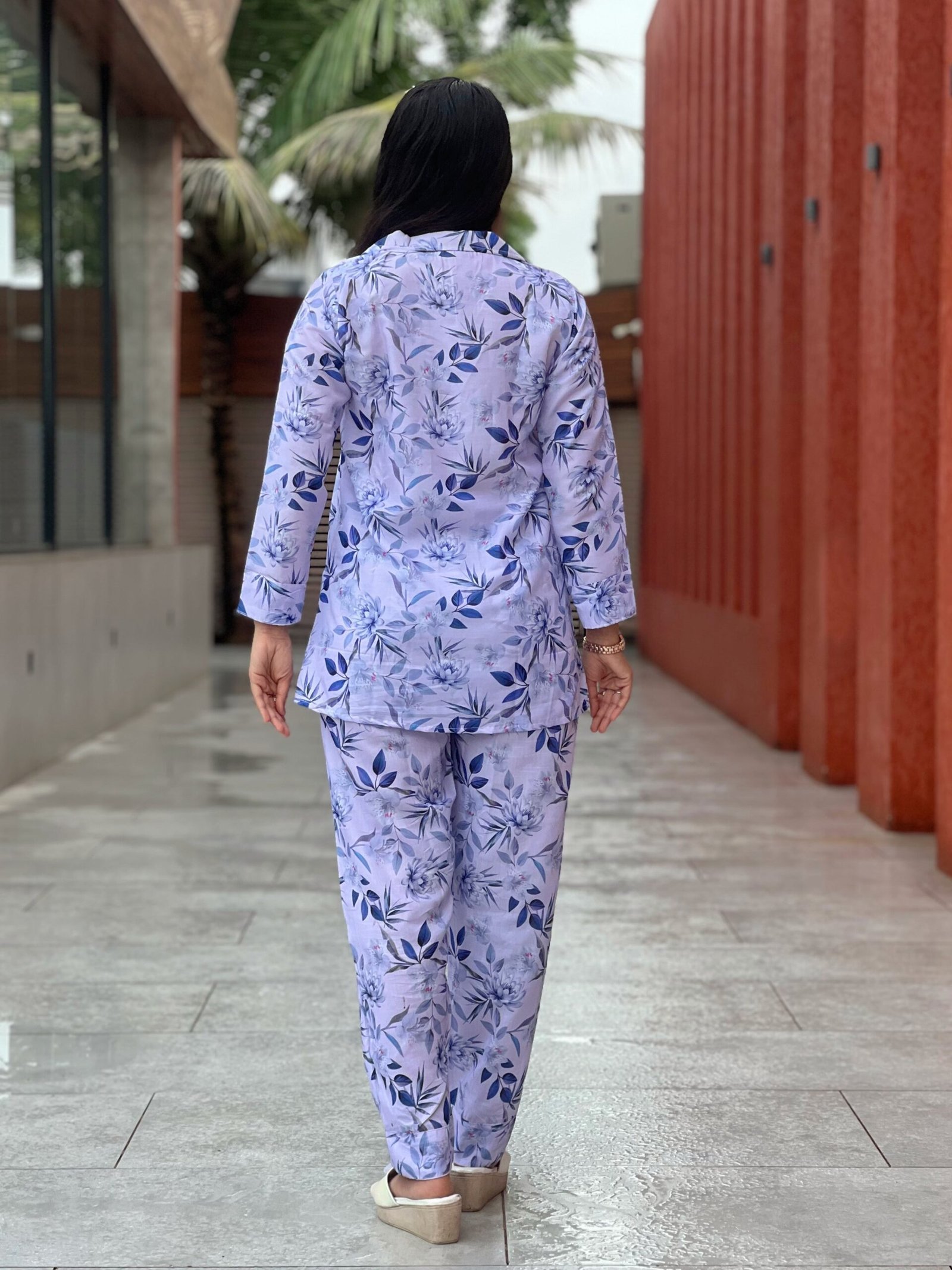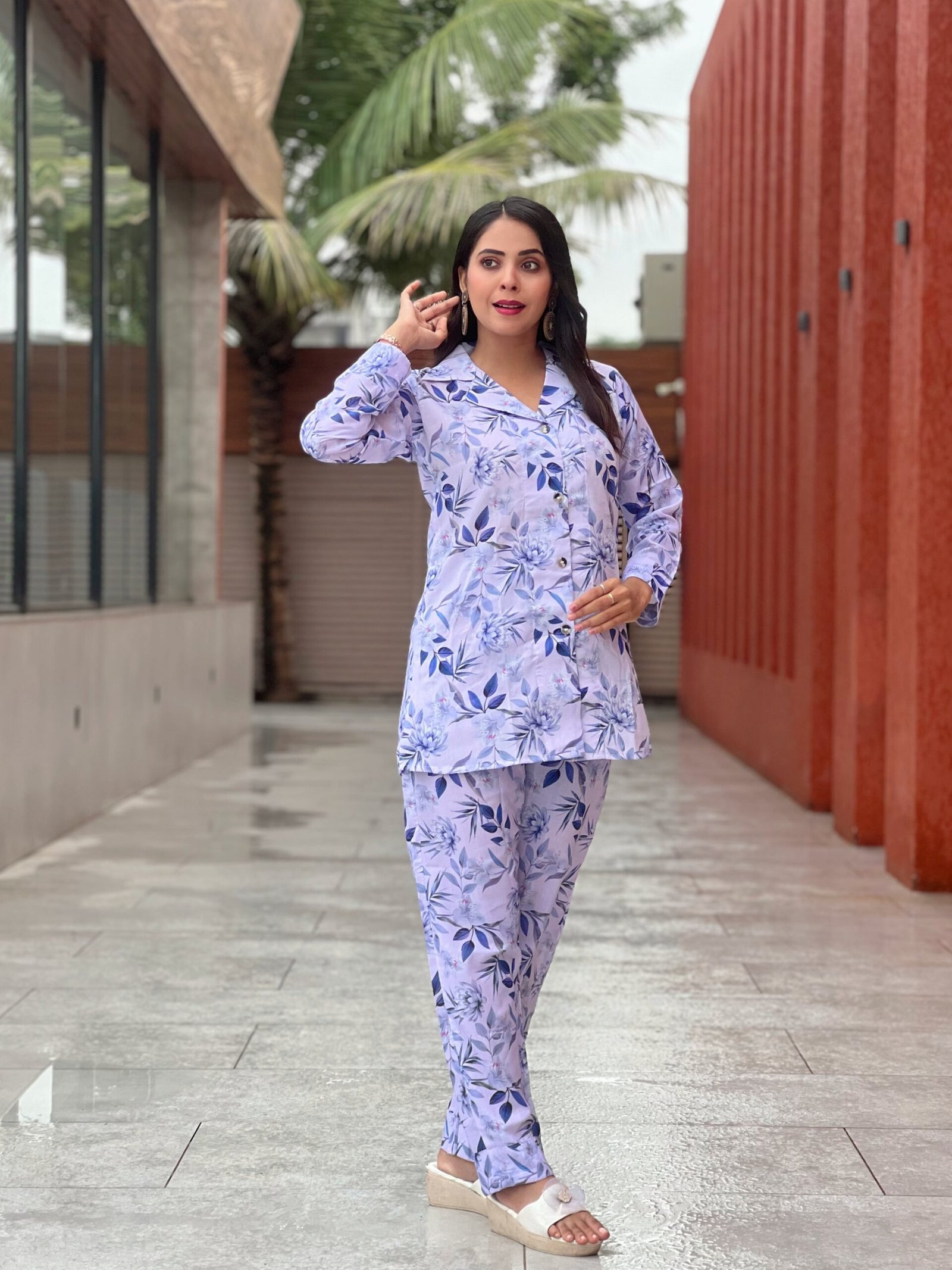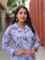 Step out in effortless style with this beautiful lavender blue floral printed women’s co-ord set. Designed with a fashionable shirt-style top and matching straight-fit pants, this coordinated outfit offers a perfect blend of comfort and elegance. Crafted from soft and breathable cotton fabric, it ensures all-day comfort while maintaining a chic and polished appearance. The subtle floral print enhances the feminine charm of the outfit, making it ideal for casual outings, travel, and everyday wear.