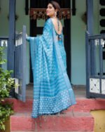 This elegant pure cotton linen saree features a beautiful blend of sky blue and white colors with intricate geometric and floral designs. The saree is accentuated with striking white patterns, including square and zigzag motifs running along the length. The pallu is adorned with matching floral and geometric prints and tassels on the edges, adding a touch of traditional charm. It comes with a matching blouse that enhances the overall look, making it perfect for casual or semi-formal occasions.